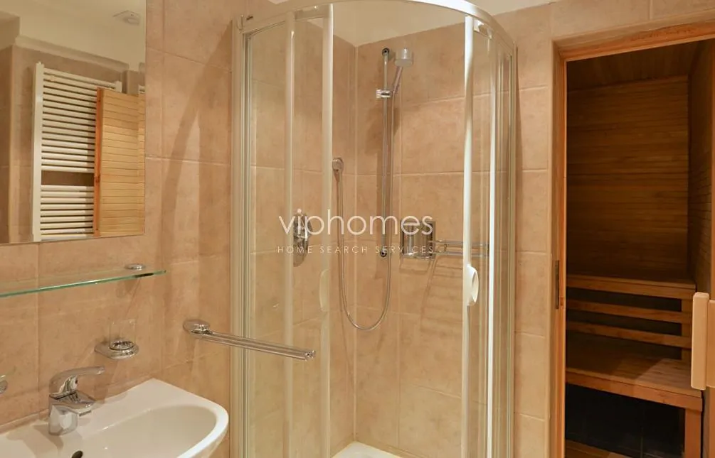 Dům nabízí k užívání 4 ložnice, 3 koupelny, velký obývací pokoj s krbem a jídelnou, kuchyňský kout/plynová varná deska, trouba, lednice, mrazák a myčka nádobí/ a vstup na zahradu, sklad a vstup do garáže, zimní zahradu (80 m2), ateliér a studio. Na každém poschodí domu je balkon či terasa. V suterénu se nachází prádelna, chladící sklad a sauna. K nemovitosti také náleží dvougaráž.