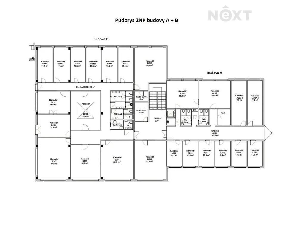 K této kanceláři si lze pronajmout sklad 11,3 m2 na 3NP.
