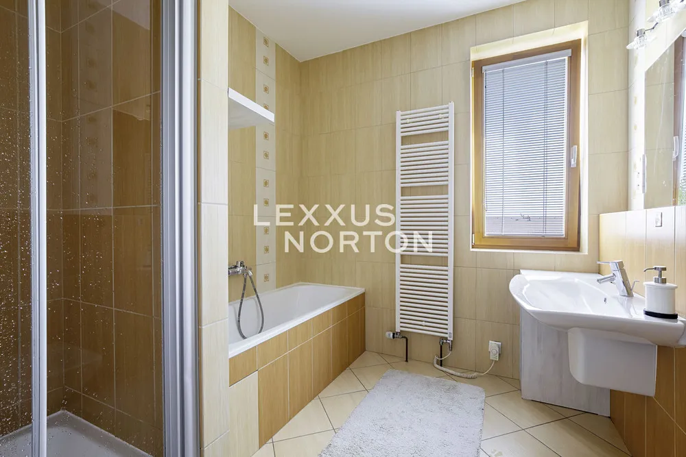 Rodinný byt 4+kk ve vynikající klidné lokalitě v sousedství německé školy v Jinonicích. Byt je součástí zdařilého rezidenčního areálu a nové dostavby původního objektu Jinonického dvora. Komorní nízkopodlažní budovy s podzemními garážemi jsou postaveny kolem rozlehlé vnitřní zahrady. Dům je situován na rohu ulic Za Zámečkem a U Panské zahrady. Byt je zde umístěn ve 3.NP objektu a z pokojů nabízí výhledy na západ, sever a východ do zmíněných ulic a zahrady s malými fontánami. Interiér zahrnuje obývací pokoj s kuchyňským koutem a lodžií, tři pohodlné ložnice, šatnu, komoru, koupelnu s vanou i sprchovým koutem a samostatnou toaletu . K bytu přísluší dvě široká parkovací stání v suterénu domu a samostatný sklep.