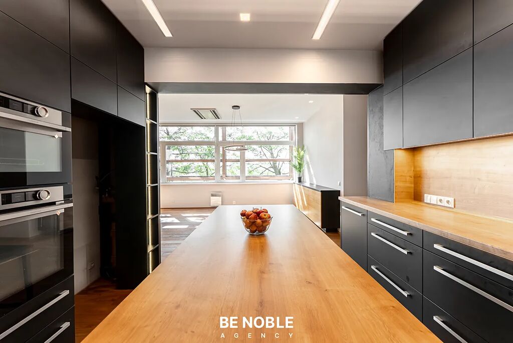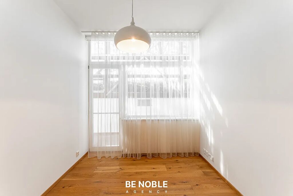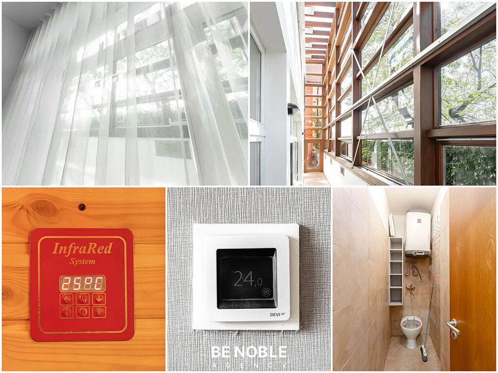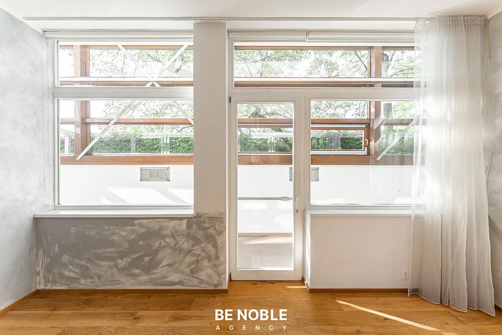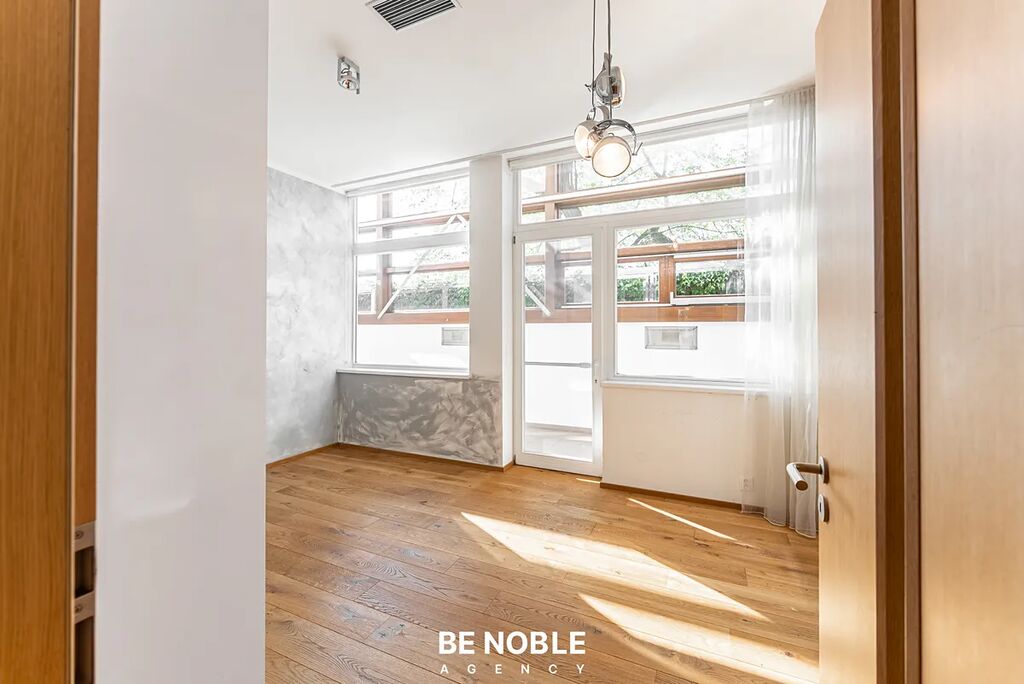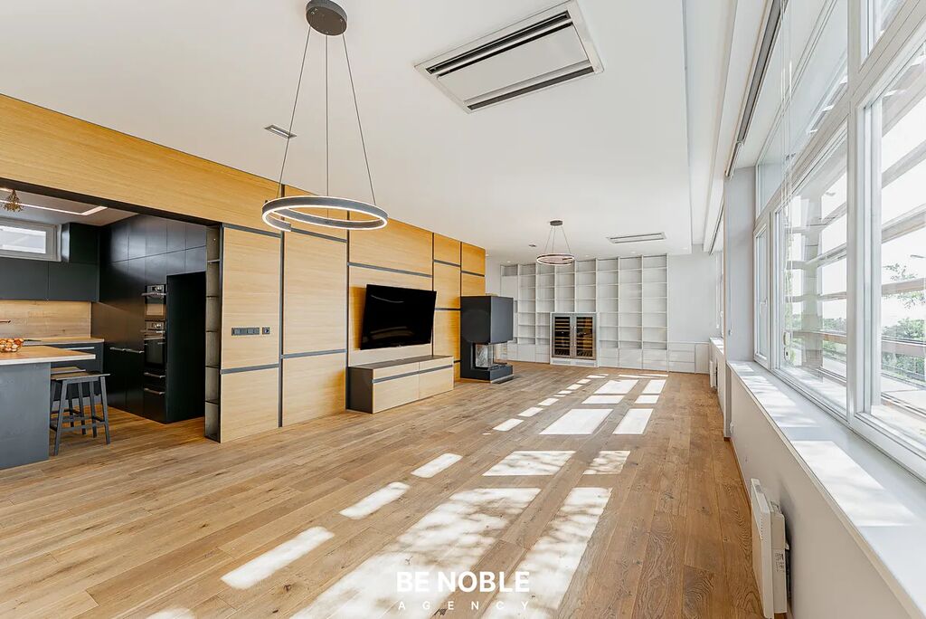 Vysoké stropy, velká okna a prosklená oranžerie s termofoliemi dodávají celému prostoru klid a harmonii. Díky této konstrukci, v kombinaci se vzrostlými stromy před okny, si byt udržuje příjemné klima – v létě chlad, v zimě teplo. Samozřejmostí je klimatizace a vnější žaluzie s velkými lamelami, které zajišťují nejen komfort, ale i soukromí.