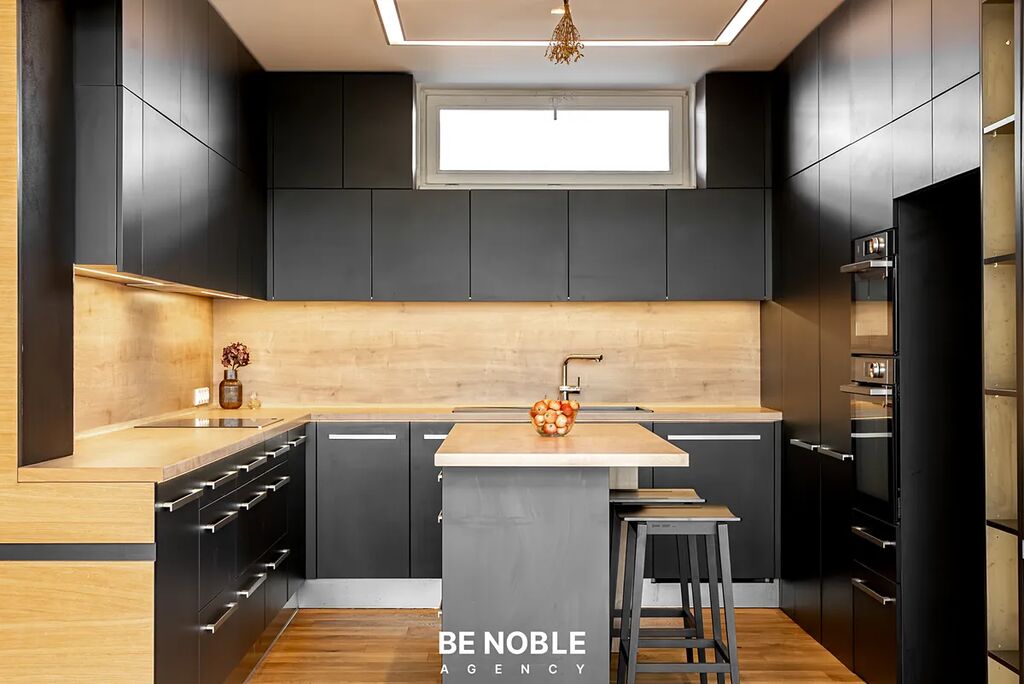 Na obývací pokoj plynule navazuje kuchyně se spíží (necelých 20 m²) – plně vybavená značkovými spotřebiči, s velkým kuchyňským ostrovem a dostatkem úložného prostoru. V horním patře se dále nachází pracovna (9,5 m²), technická místnost (2,5 m²) a koupelna se sprchovým koutem a toaletou (7 m²).