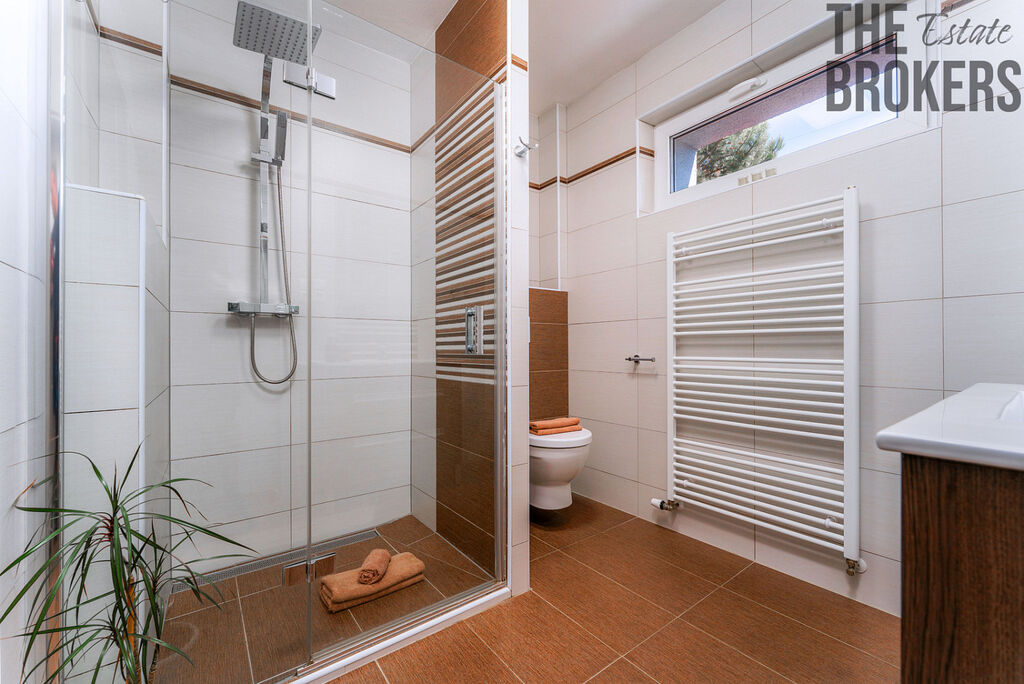 V patře se nachází prostorná ložnice s vlastní šatnou, dva další pokoje, druhá koupelna a opět samostatné WC.