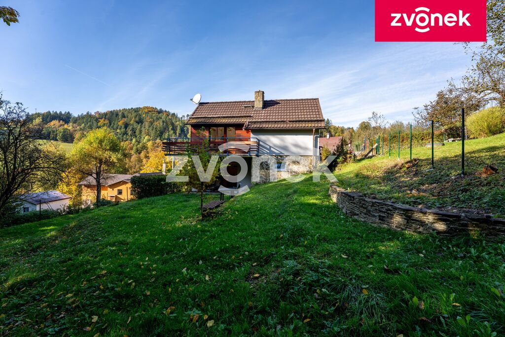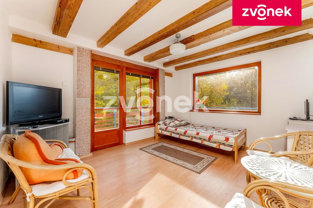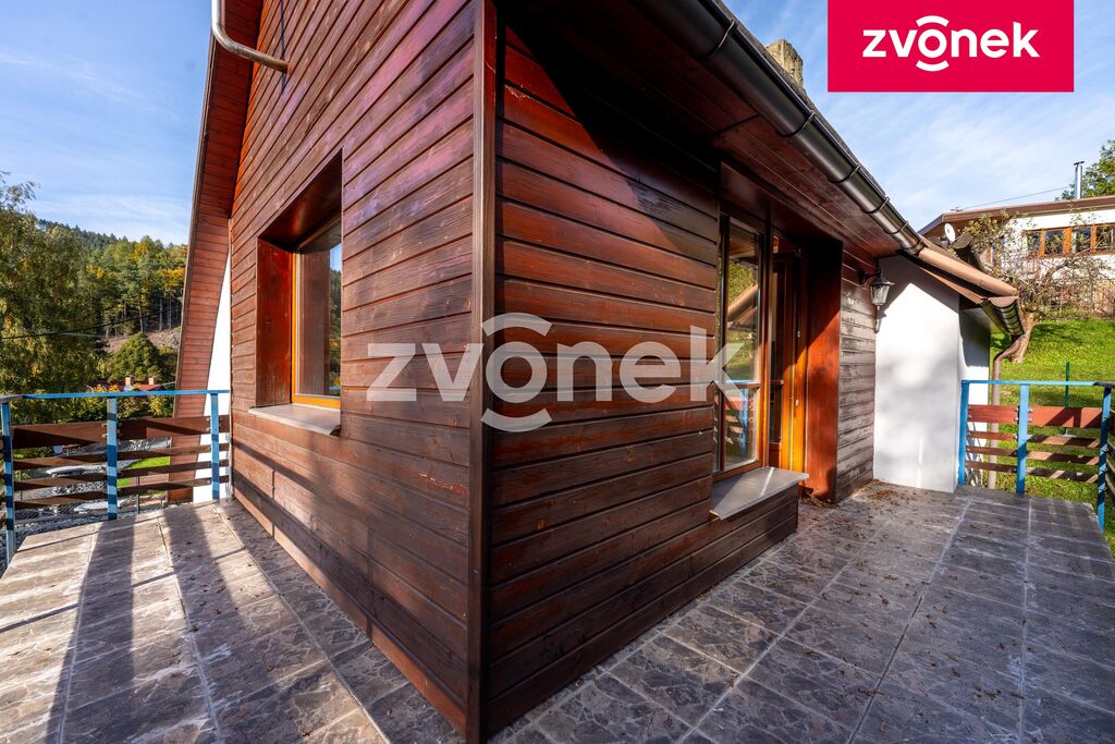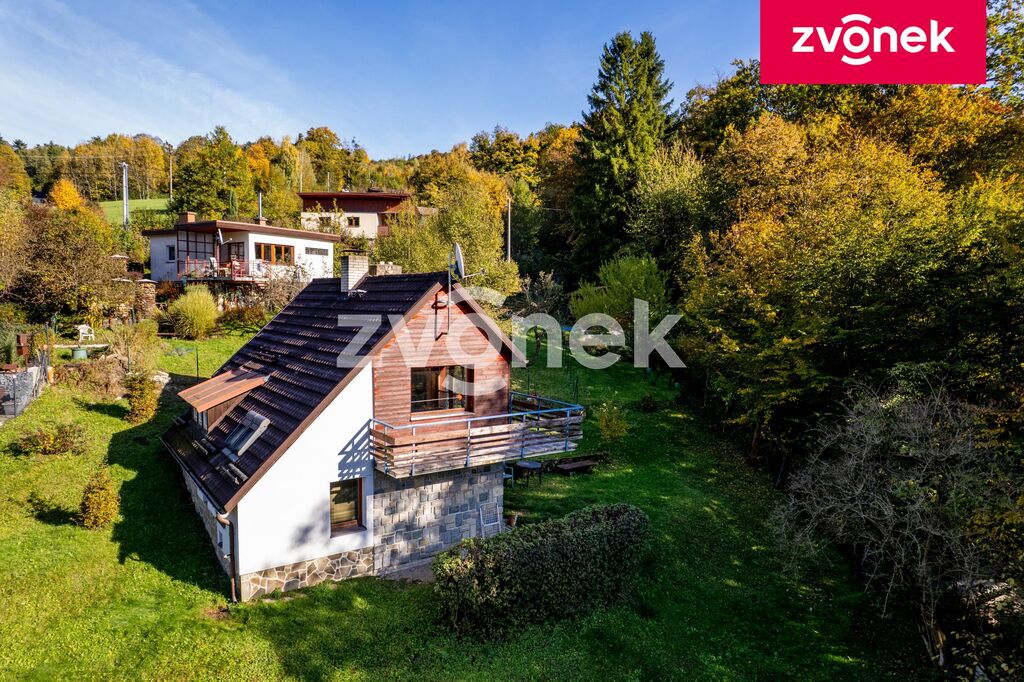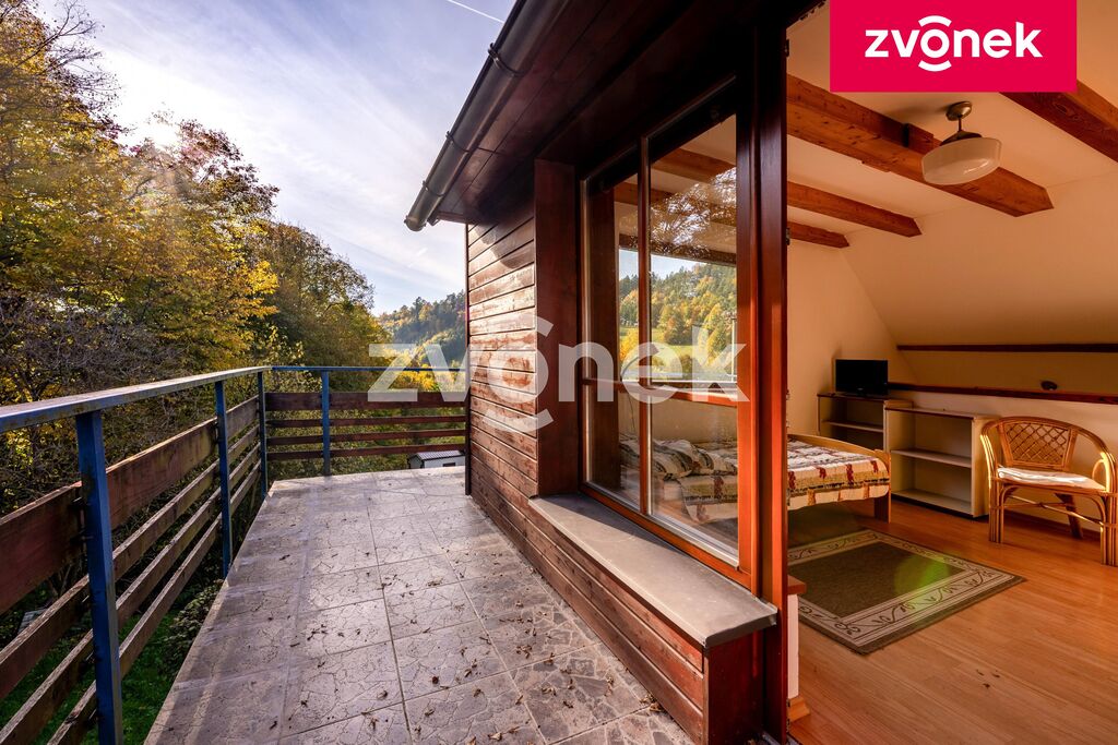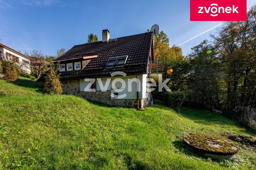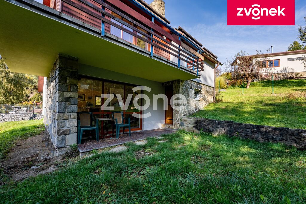 Dispoziční řešení interiéru: vstupní chodba, koupelna s WC, schodiště - po několika stupních se schází do kuchyňky s obývacím pokojem, který je opticky propojen prosklenými dveřmi s exteriérem. Druhá část schodiště vede do podkroví, kde se nacházejí dvě ložnice, z větší místnosti je výstup na prostorný balkon. Ve sklepní části (zapuštěna do svahu) se nachází společenská místnosti, přístupná zvenčí. Voda rozvedena ze studny (vrt), odpady svedeny do septiku. Vytápění - krb a krbová kamna, ohřev vody el.bojlerem. Součástí kupní ceny je pozemek, který zajišťuje právní i fyzický přístup k nemovitosti a je zde vystavěno kryté stání pro auto.