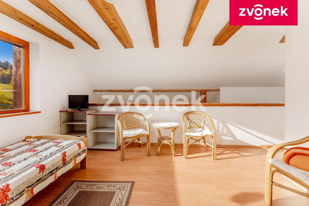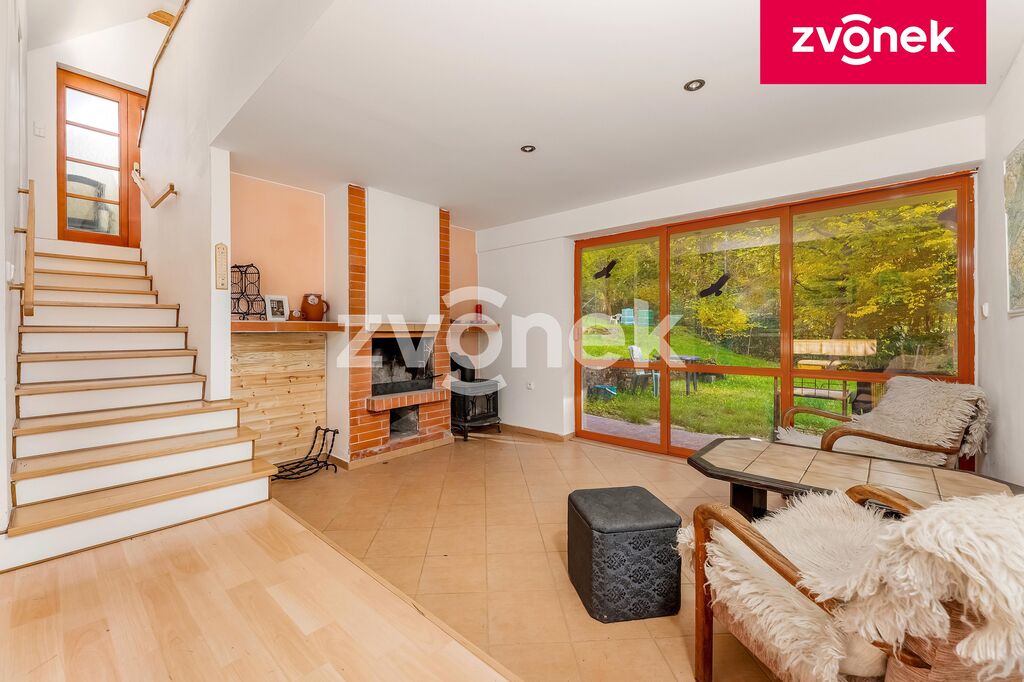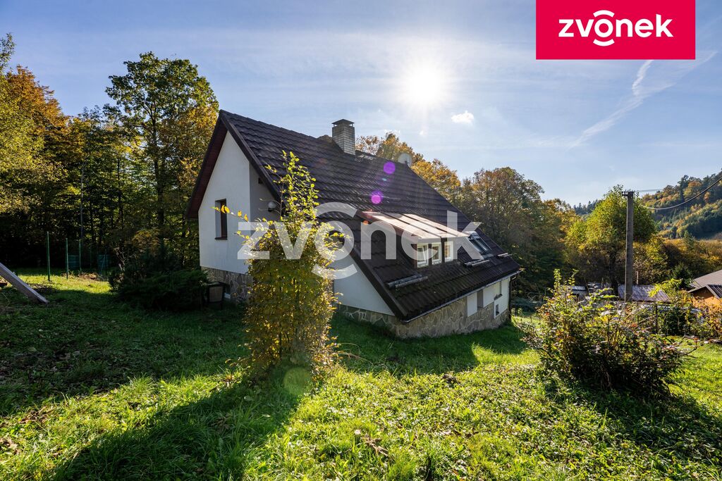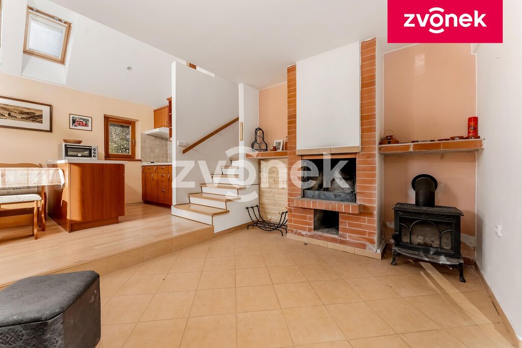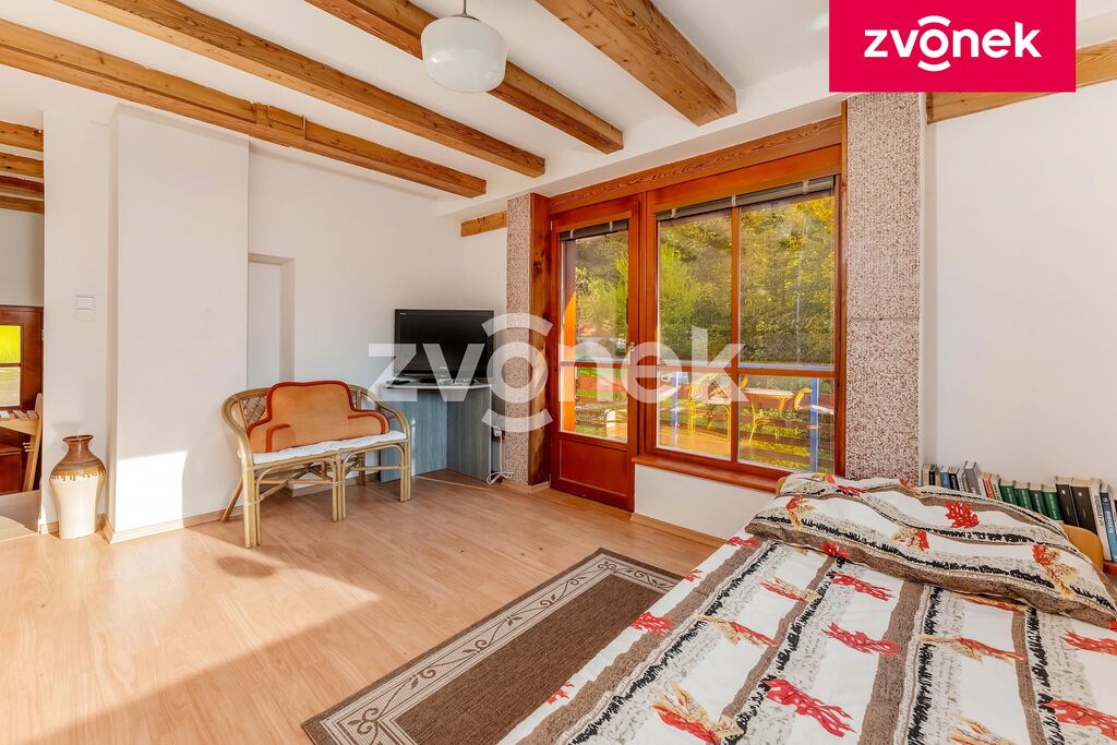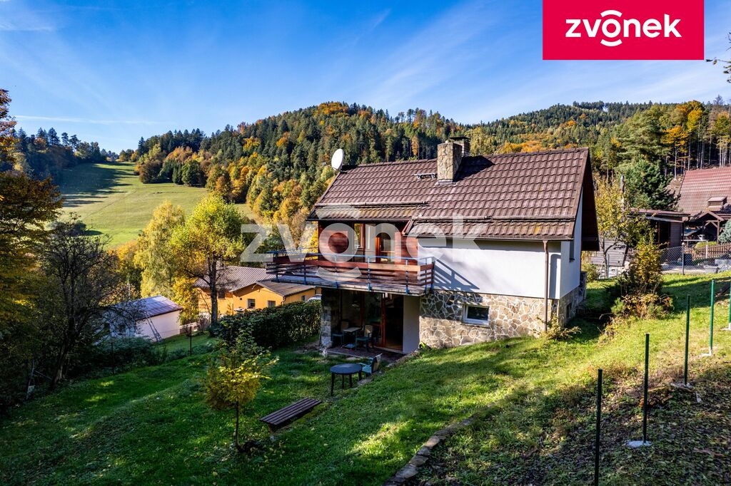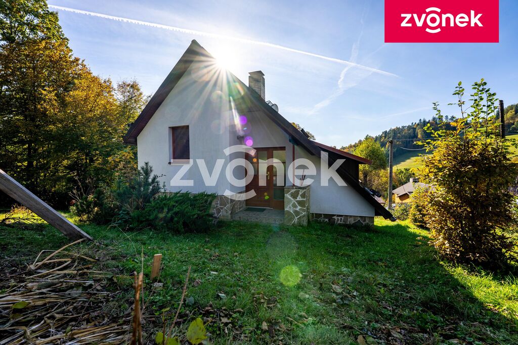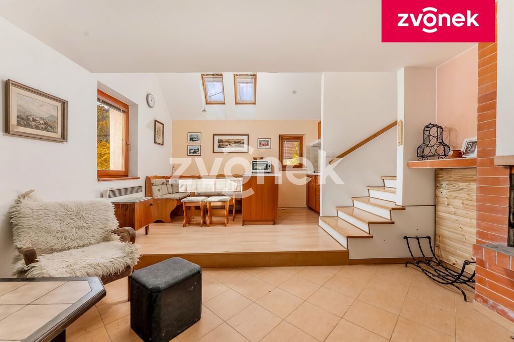 Dispoziční řešení interiéru: vstupní chodba, koupelna s WC, schodiště - po několika stupních se schází do kuchyňky s obývacím pokojem, který je opticky propojen prosklenými dveřmi s exteriérem. Druhá část schodiště vede do podkroví, kde se nacházejí dvě ložnice, z větší místnosti je výstup na prostorný balkon. Ve sklepní části (zapuštěna do svahu) se nachází společenská místnosti, přístupná zvenčí. Voda rozvedena ze studny (vrt), odpady svedeny do septiku. Vytápění - krb a krbová kamna, ohřev vody el.bojlerem. Součástí kupní ceny je pozemek, který zajišťuje právní i fyzický přístup k nemovitosti a je zde vystavěno kryté stání pro auto.