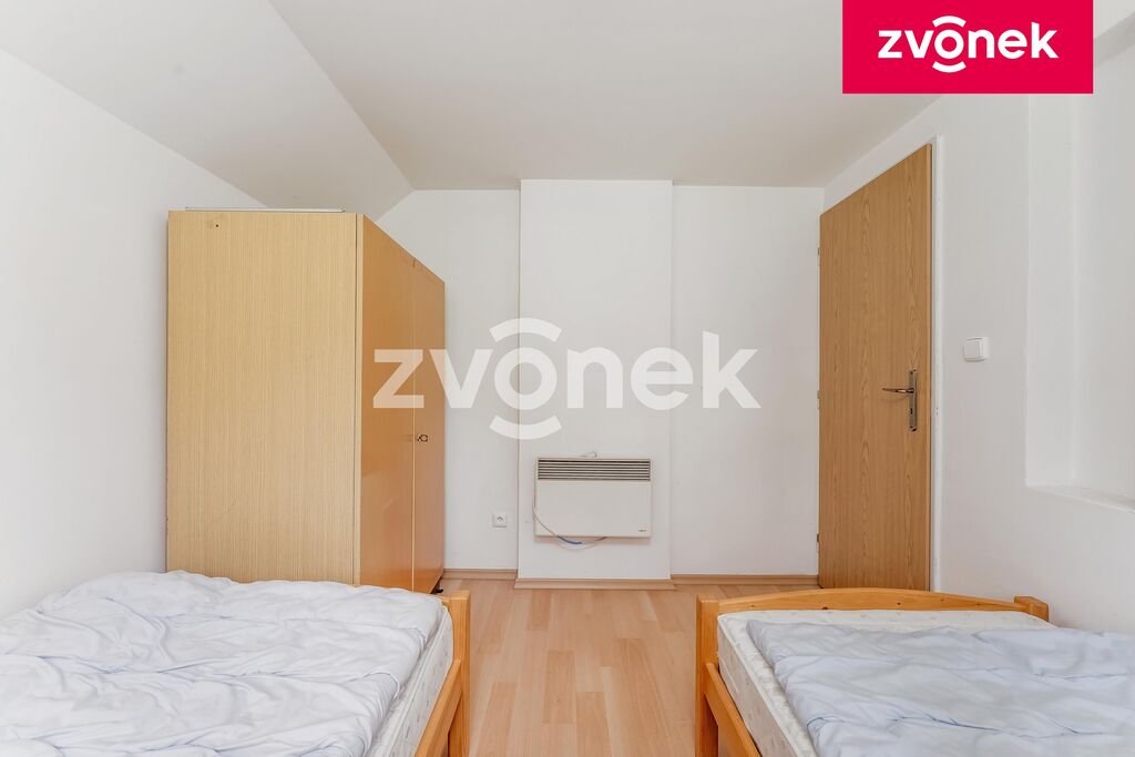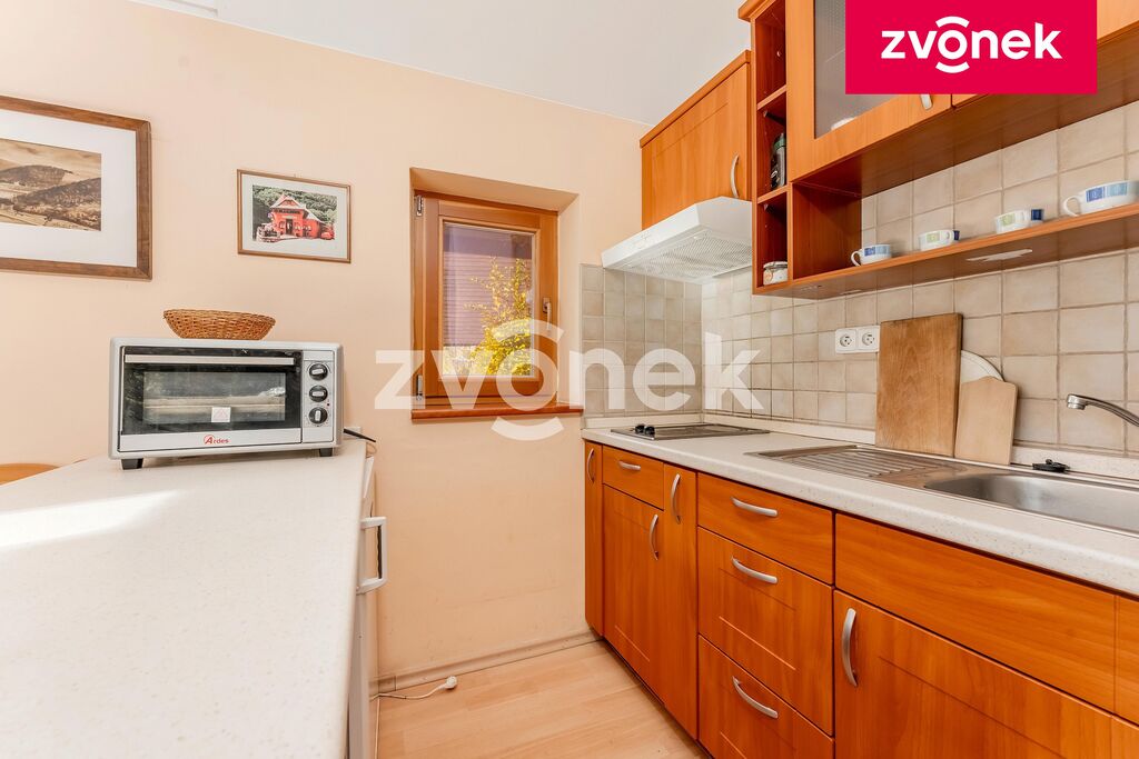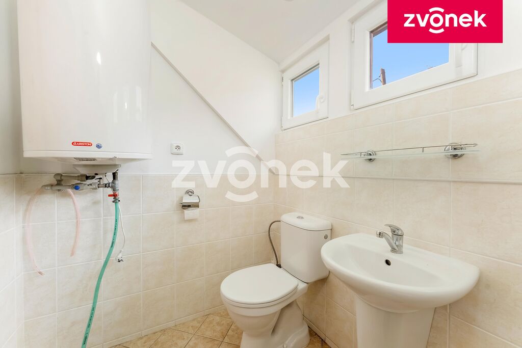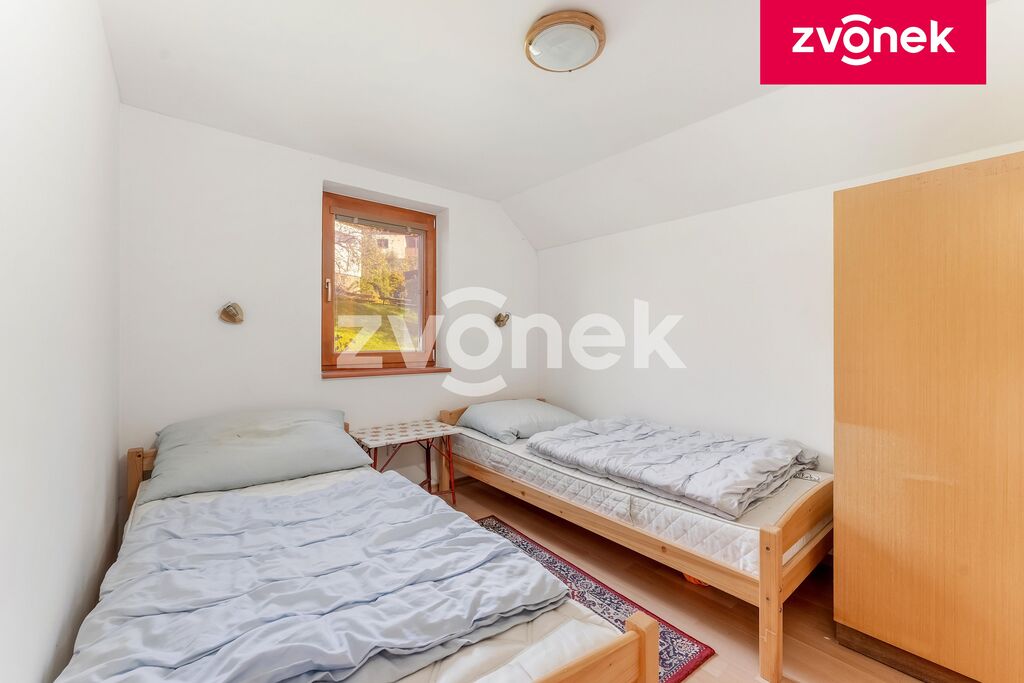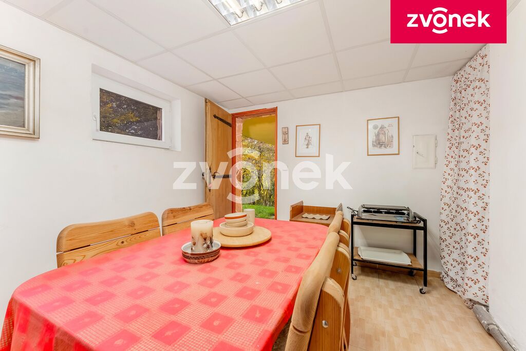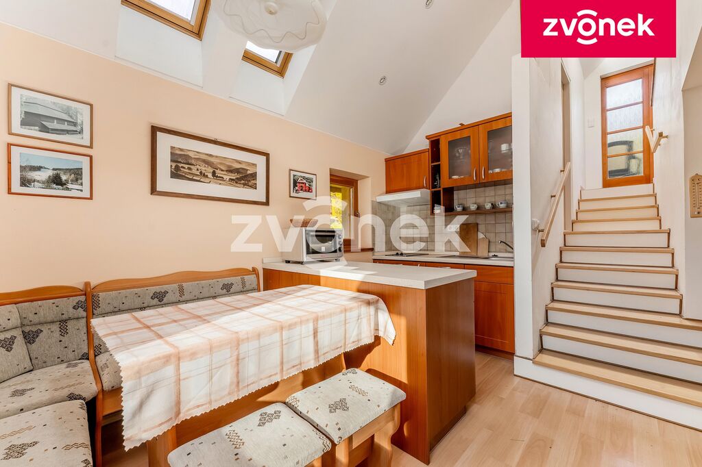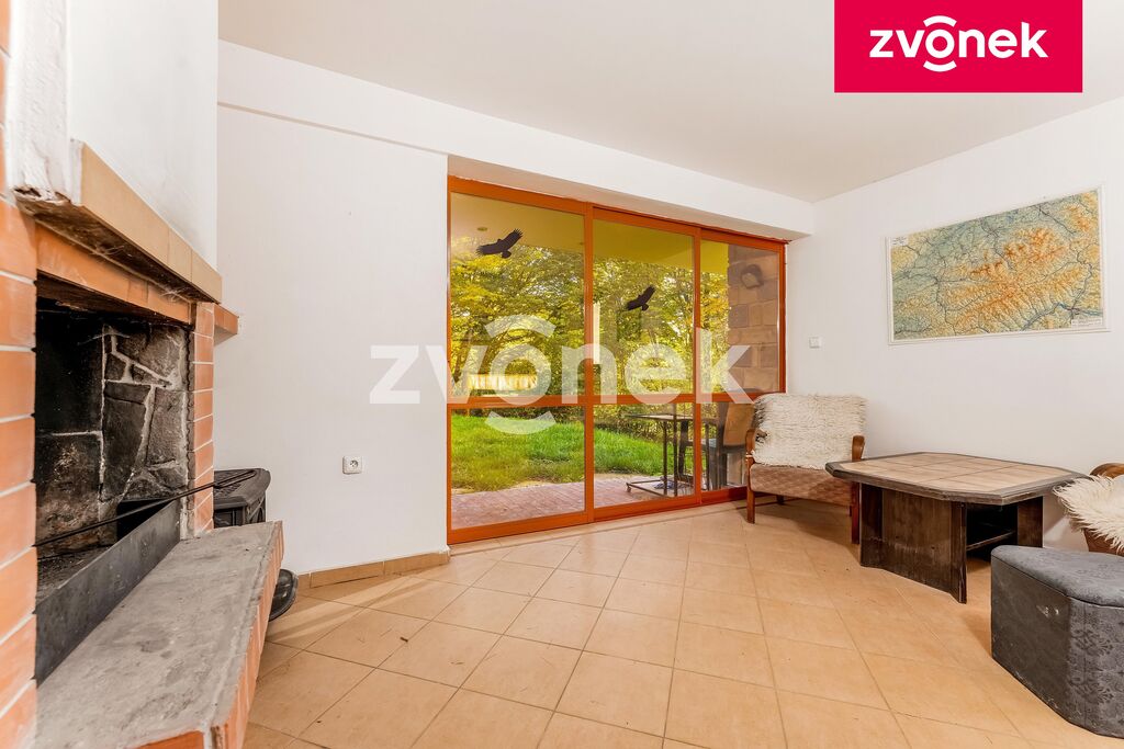 Dispoziční řešení interiéru: vstupní chodba, koupelna s WC, schodiště - po několika stupních se schází do kuchyňky s obývacím pokojem, který je opticky propojen prosklenými dveřmi s exteriérem. Druhá část schodiště vede do podkroví, kde se nacházejí dvě ložnice, z větší místnosti je výstup na prostorný balkon. Ve sklepní části (zapuštěna do svahu) se nachází společenská místnosti, přístupná zvenčí. Voda rozvedena ze studny (vrt), odpady svedeny do septiku. Vytápění - krb a krbová kamna, ohřev vody el.bojlerem. Součástí kupní ceny je pozemek, který zajišťuje právní i fyzický přístup k nemovitosti a je zde vystavěno kryté stání pro auto.