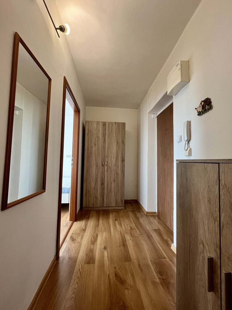 Byt se nabízí plně vybavený. Součástí kuchyňské linky je elektrická trouba a plynový sporák, lednice a jídelní stůl se dvěmi židlemi. Z kuchyně se také dostaneme na balkon.