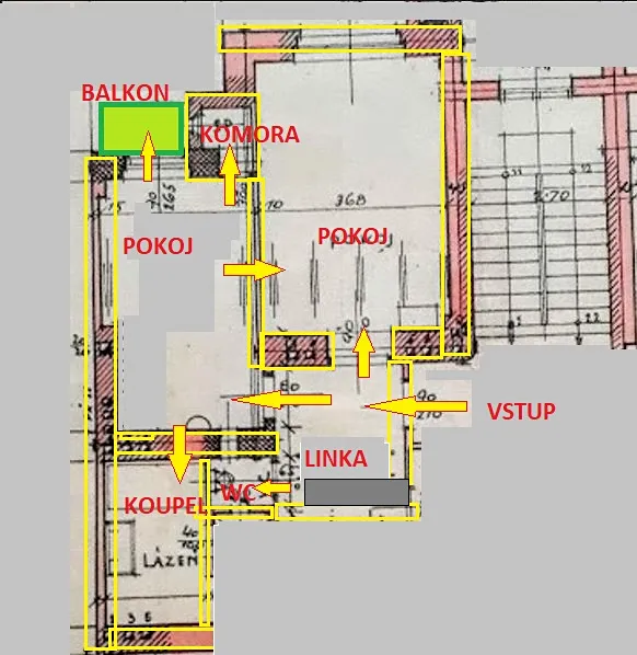 Velikost bytu: 2+k.k./balkon/spižírna, 46 m2; 2 pokoje á 20 a 14 m2, komora 1,2 m2, balkon 0,6 m2, koupelna, WC samostatné, kuchyňská linka v předsíni 7 m2; původní dispozice bytu 1+1; neprůchozí pokoje;