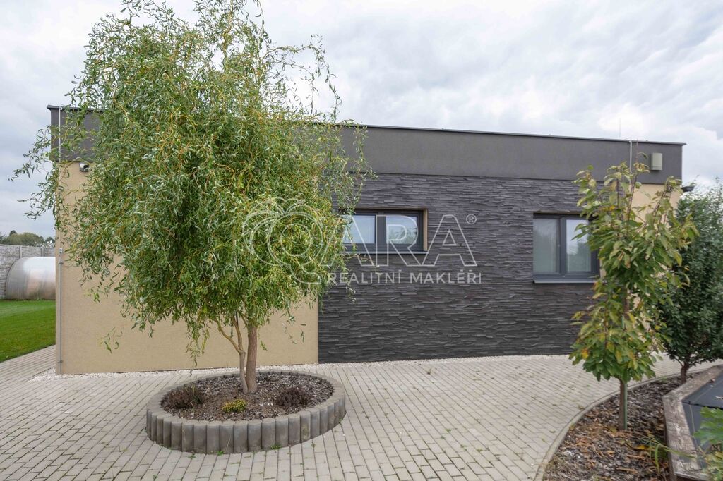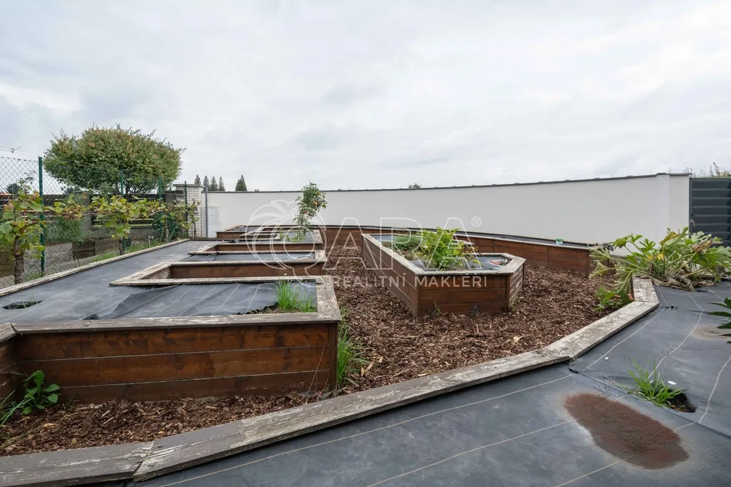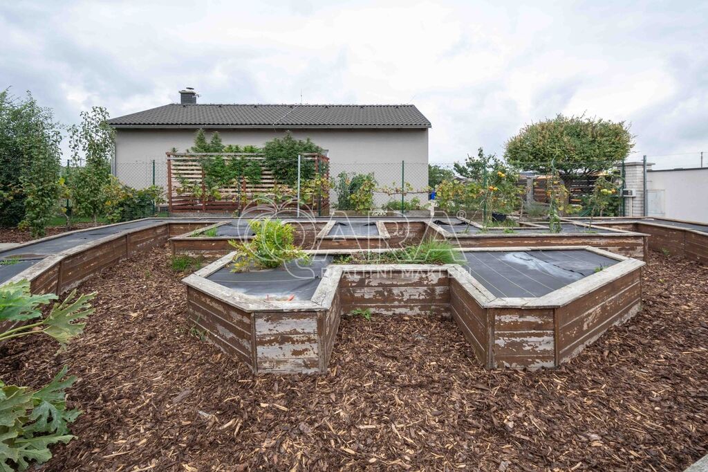 • Zahrada – travní koberce, centrální závlaha, vyvýšené záhony, rozvod studniční vody do každého záhonu, jímky na dešťovku (2 m3), příprava pro el. ovládání vrat, přístřešek na dřevo.