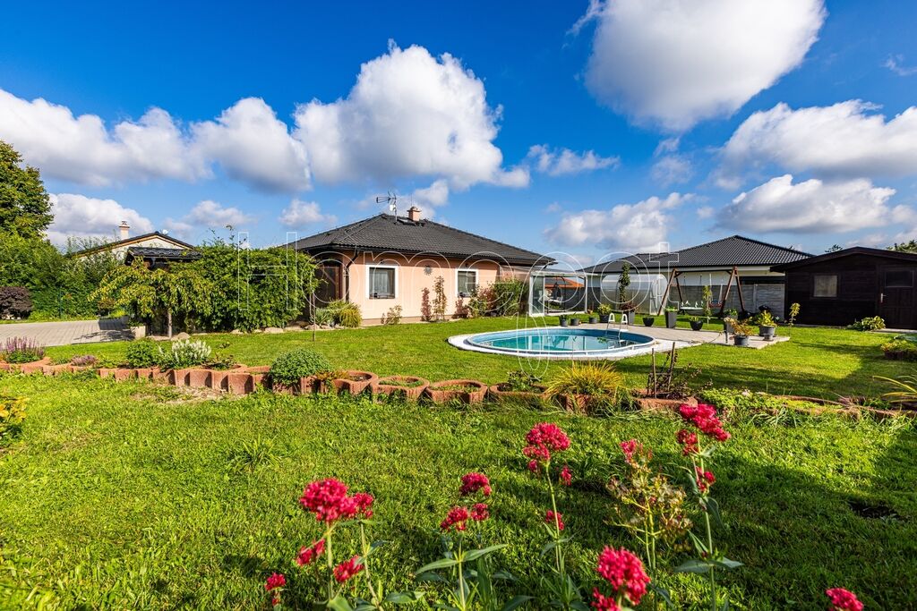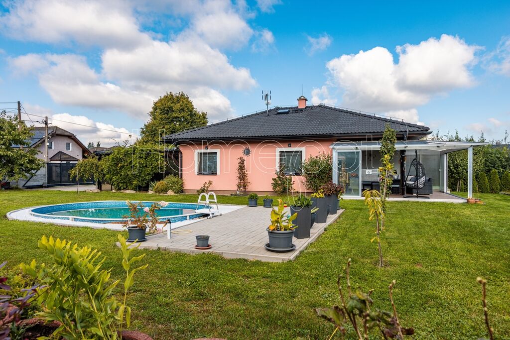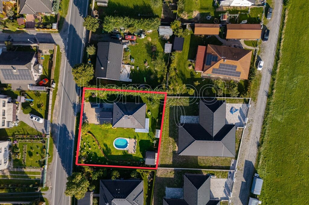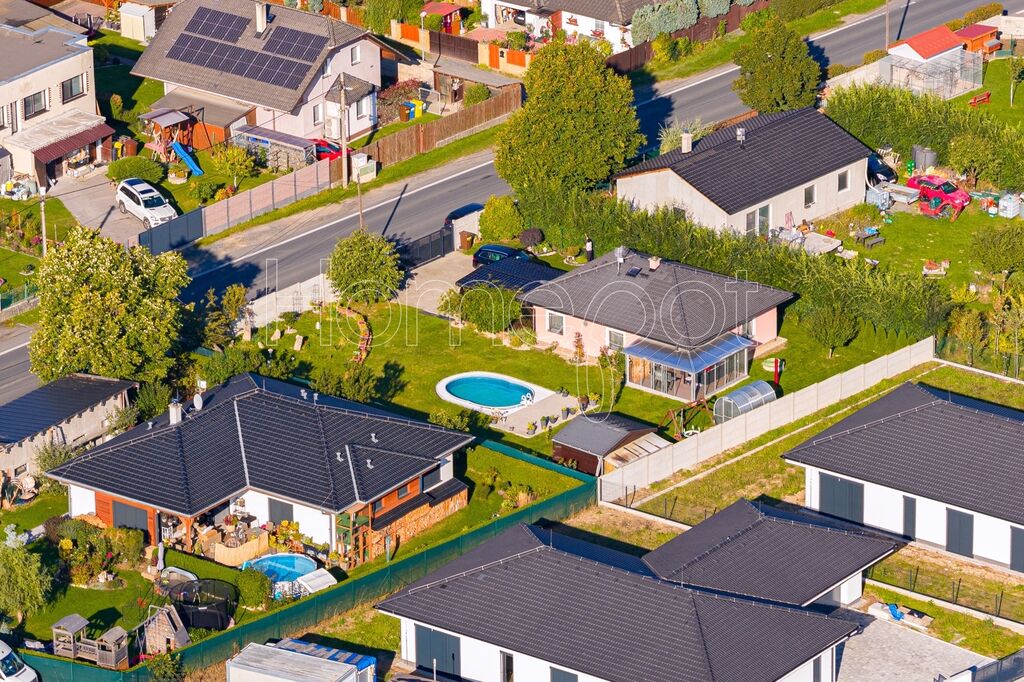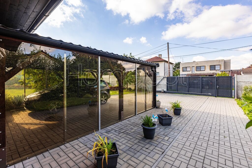 Pozemek o celkové výměře 911 m² je skutečnou oázou klidu. Zahrada (824 m²) není jen trávník, ale živý prostor pro relaxaci i zábavu. Nabízí bazén pro letní osvěžení, skleník pro vášnivé pěstitele a zahradní domek, který skvěle poslouží jako dílna pro kreativní práci nebo sklad nářadí. Kryté parkovací stání pro dvě auta chrání vaše vozy a je elegantně zakomponováno tak, aby nerušilo výhled.