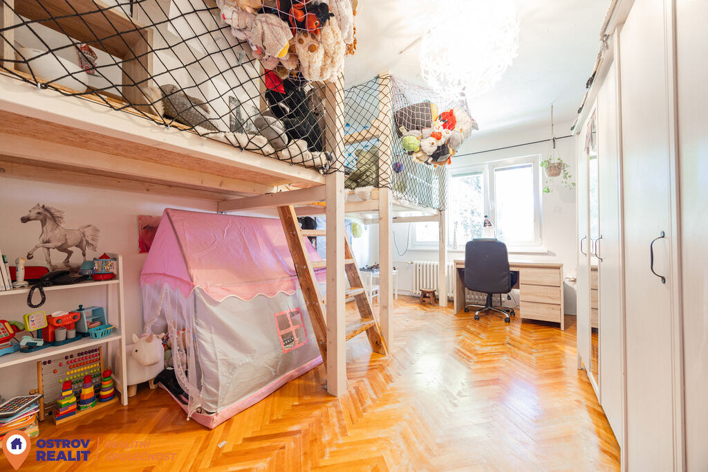 Byt se prodává částečně vybavený – v dětském pokoji zůstává spací patro, které lze dle potřeby zachovat nebo demontovat, čímž vznikne další plnohodnotná ložnice.