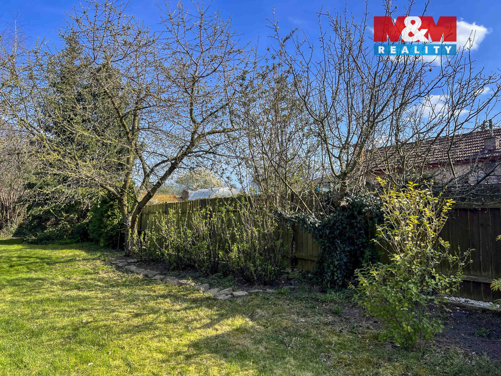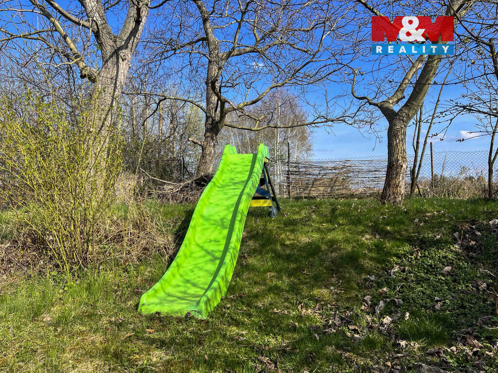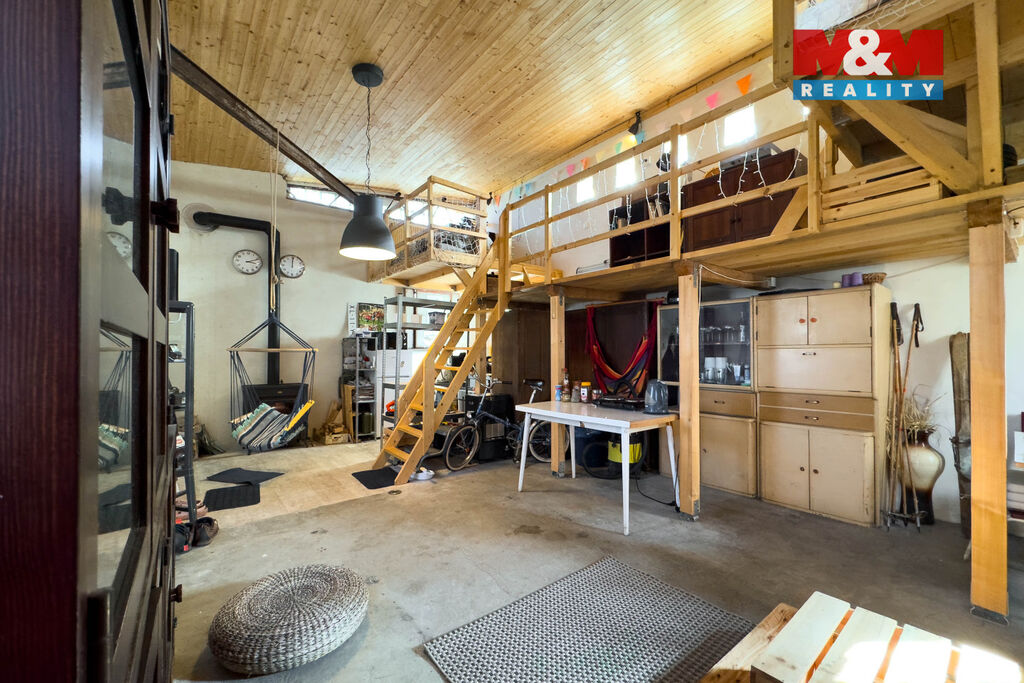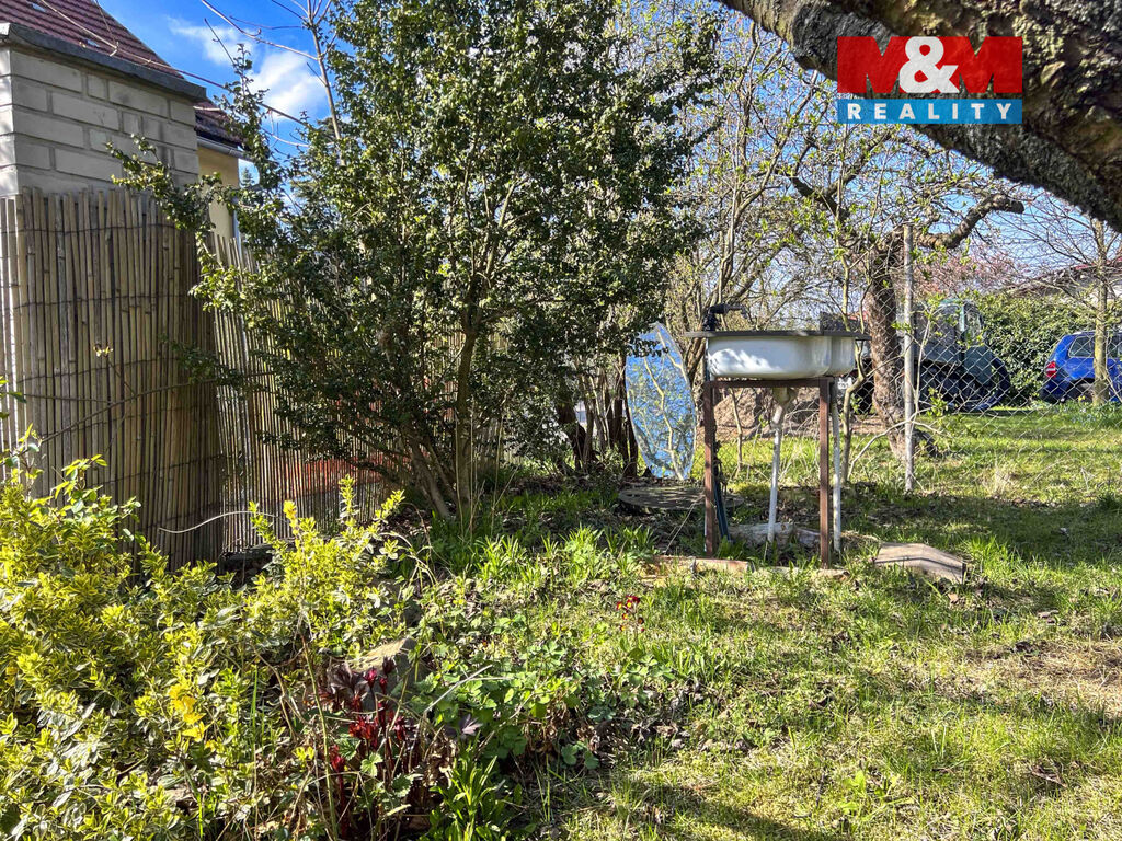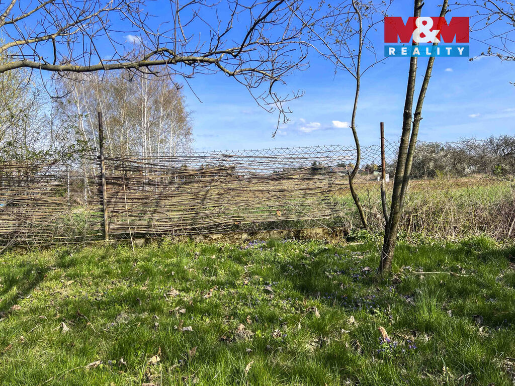 Součástí pozemku je zděná stavba (42 m²), která slouží jako víkendový domek s dřevěným patrem, zavedenou vodou a vytápěním kamny – ideální jako dočasné bydlení během stavby či jako rekreační objekt. Nechybí ani praktický dřevěný domek pro uskladnění materiálu v zadní části a malá kůlna.