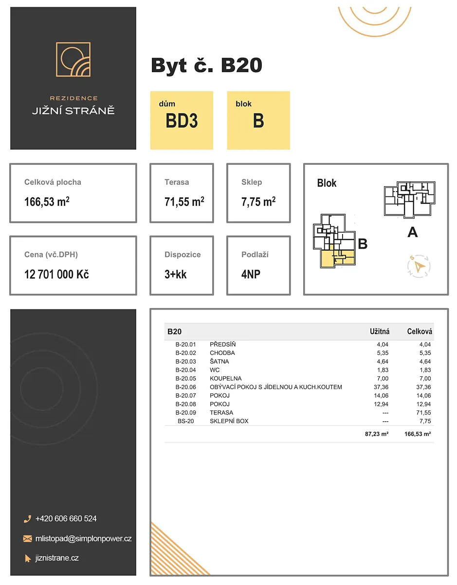 V této druhé etapě vznikne bytový dům BD3 o dvou blocích A,B propojených suterénním parkovištěm s celkem 36 byty. V rámci této etapy vám nabízíme k prodeji byt s výhledem o dispozici 3+kk ve 4NP (označení BD3_B20) s celkovou plochou 166,53 m² (byt 87,23 m², terasa 71,55 m² a sklep 7,75 m²).