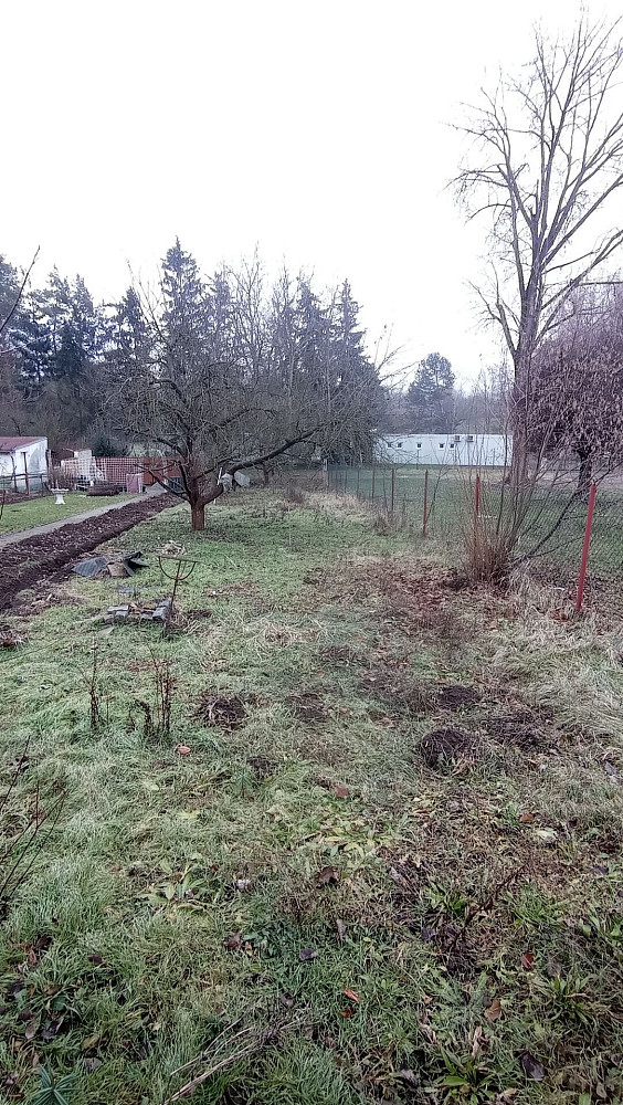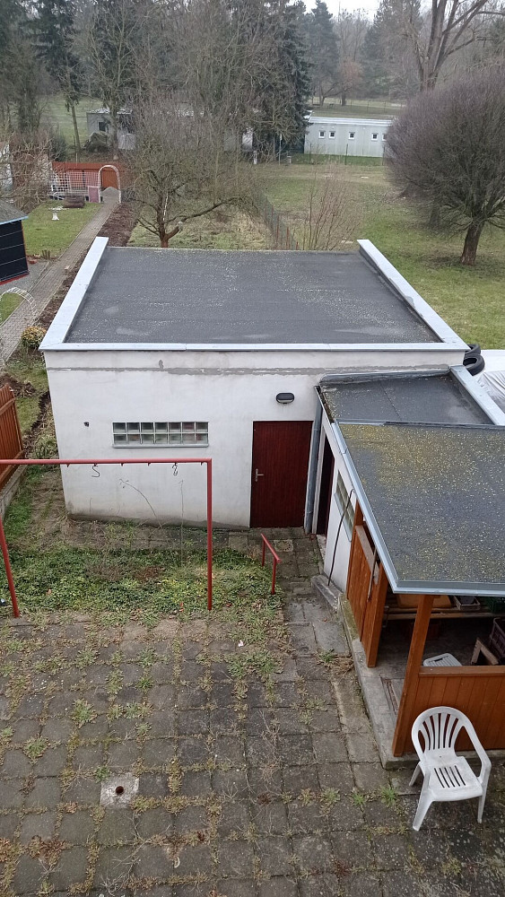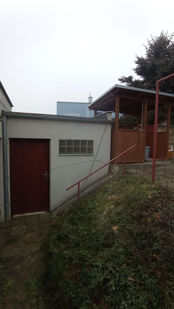 V zahradě byla vystavěna prostorná dvojgaráž, před kterou pohodlně zaparkujete další dvě auta.