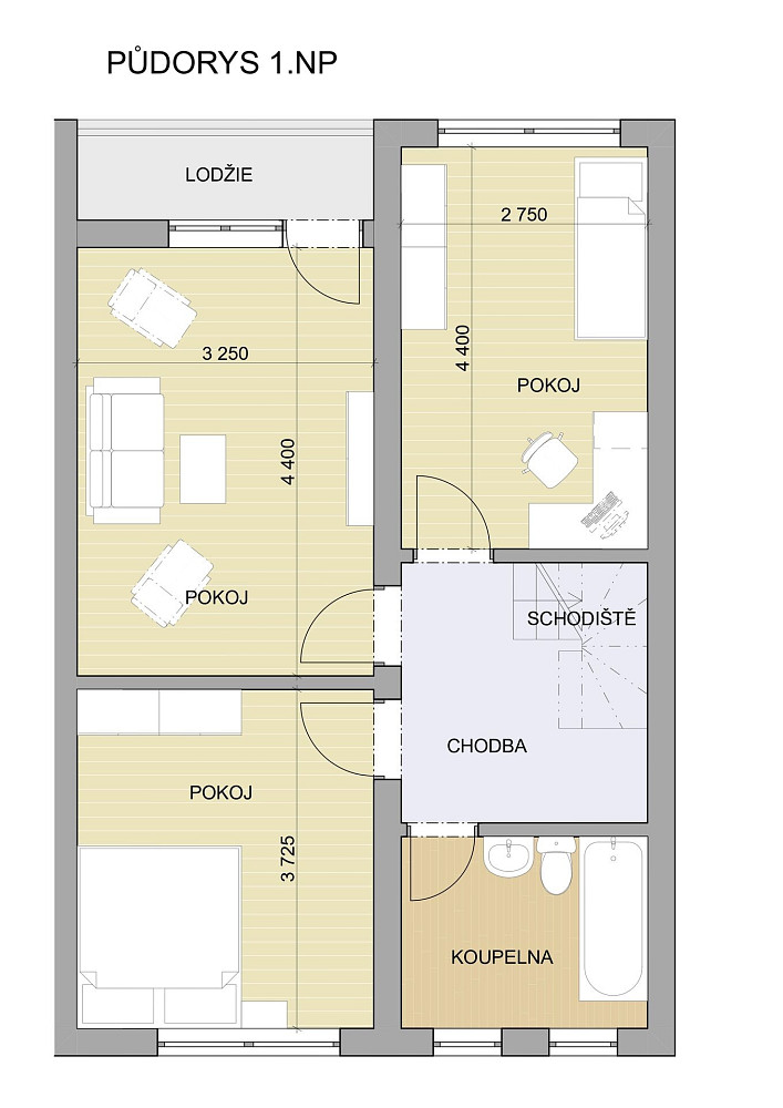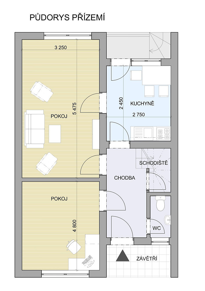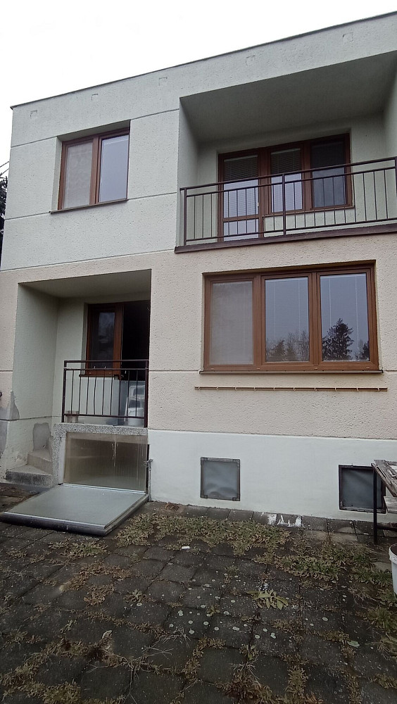 V přízemí jsou k dispozici dva pokoje, kuchyně a WC. Z kuchyně se vchází balkonovými dveřmi na přilehlý dvůr a zahradu. Jedna z přízemních místností byla upravená na bezbariérové bydlení se sprchovým koutem. V prvním patře domu se nachází tři pokoje a koupelna s vanou.