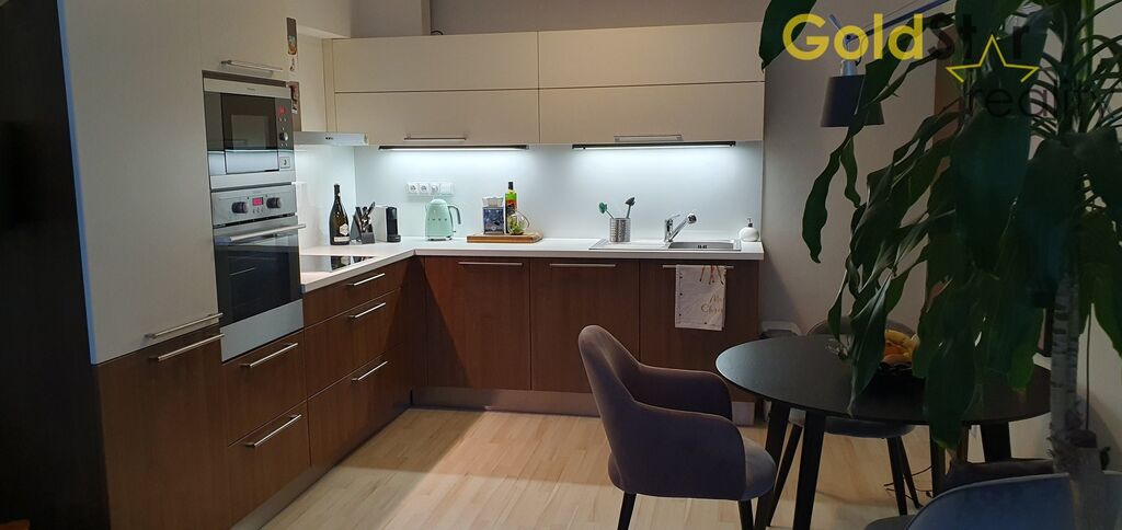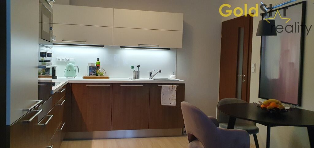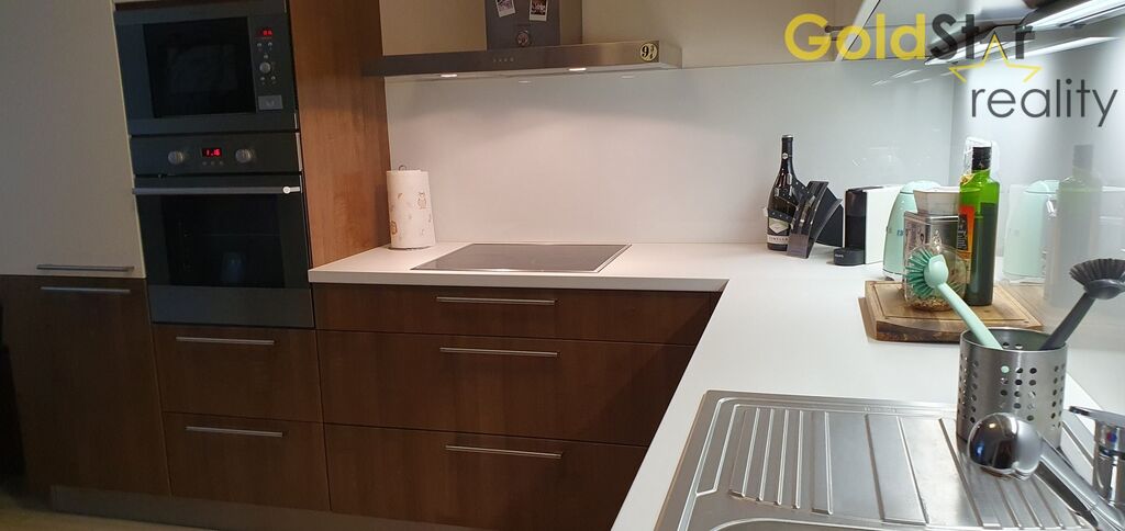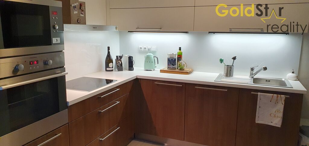 Součástí prodeje je kompletní vybavení na míru – kuchyňská linka se všemi vestavěnými spotřebiči (včetně myčky a velké lednice s mrazákem), televizní stolek, vestavěná šatní skříň, kompletní vybavení chodby a komory a další zakázkový nábytek od společnosti Hanák. V bytě jsou kvalitní plovoucí podlahy a stylové osvětlení. Byt je napojen na ústřední topení, internet i satelit. Byt je ve skvělém stavu a je ihned k nastěhování.