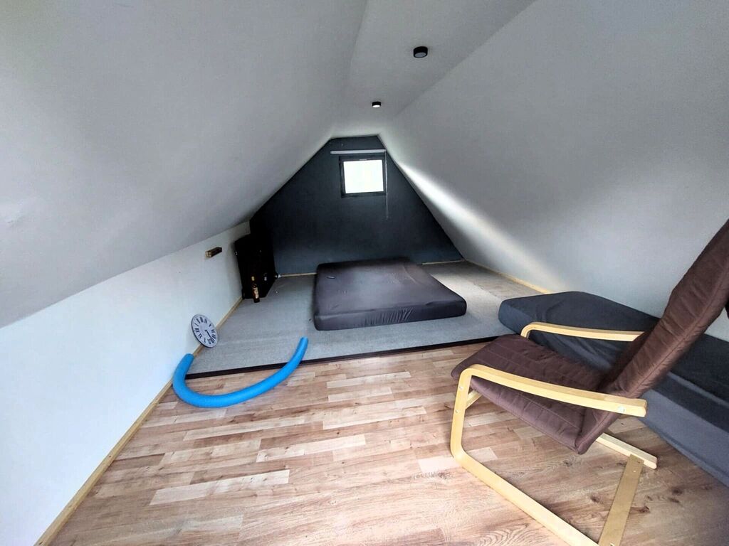 V patře chatky se nachází prostor na spaní, kam se dostanete po dřevěných schodech.