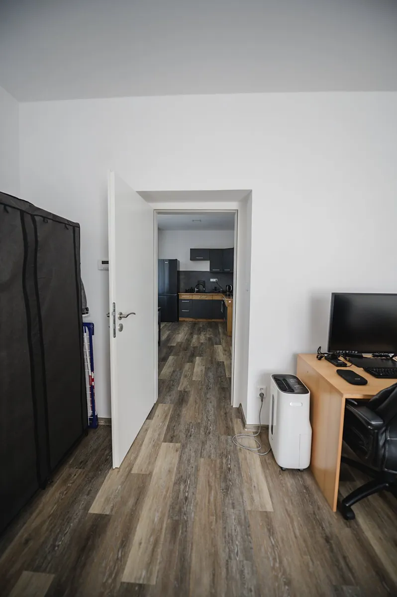 Výměra bytu je cca 46m2 . Po vstupu do bytu je prostorná předsíň se vstupy do koupelny s WC a kuchyně. V předsíni jsou na míru vyrobené vestavěné skříně, kde je mimo úložného prostoru na oblečení i místo na elektrokotel, bojler na ohřev vody a místo na pračku. Koupelna má sprchový kout, umyvadlo a WC. Dále je z předsíně vstup do kuchyně a za ni je velký pokoj se 2 okny.