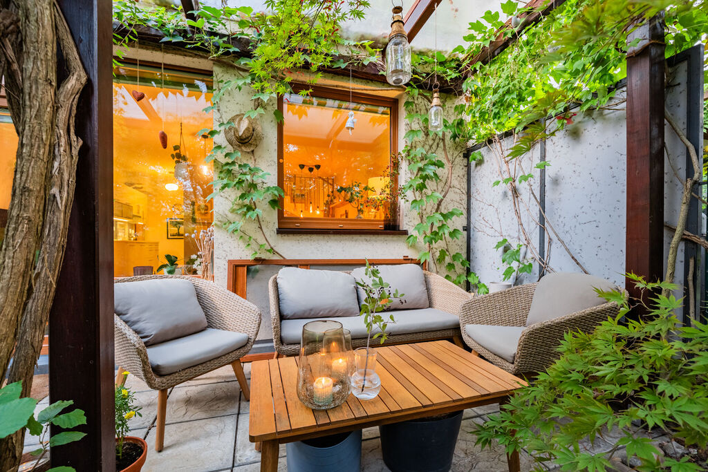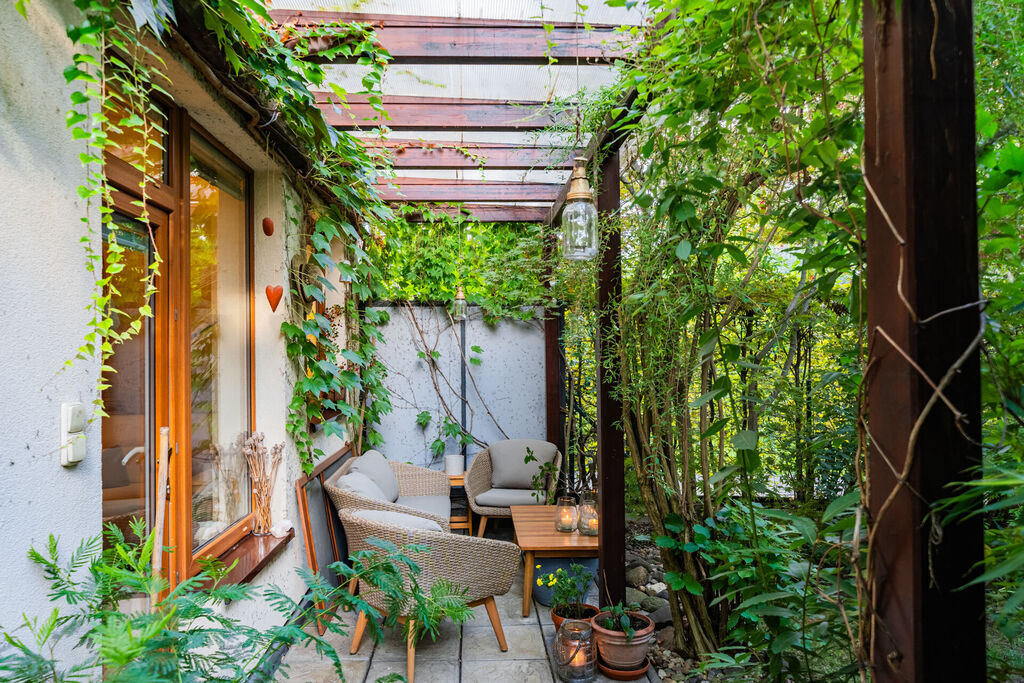 Přízemí bytu tvoří obývací pokoj se vstupem na terasu a dále do zahrady. Terasa je zastřešená a zvětšuje tak užitný prostor bytu. Zahrada je rovinatá se vzrostlými dřevinami, které poskytují nejen pocit, že jste součástí přírody, ale poskytují i velmi příjemné klima v přízemní části bytu. Obývací pokoj je prakticky propojený s jídelnou a kuchyňským koutem. Kuchyně je vybavená kuchyňskou linkou se spotřebiči. Dále je zde prostorná ložnice s vestavnými skříněmi. Z ložnice je také umožněn přístup na terasu. Samozřejmostí je koupelna se sprchovým koutem a toaletou. Velmi příjemný je fakt, že ze zahrady vede branka k zadní přístupové cestě, na kterou se dostanete pohodlně autem, což je velmi praktické v rámci zásobování či stěhování.