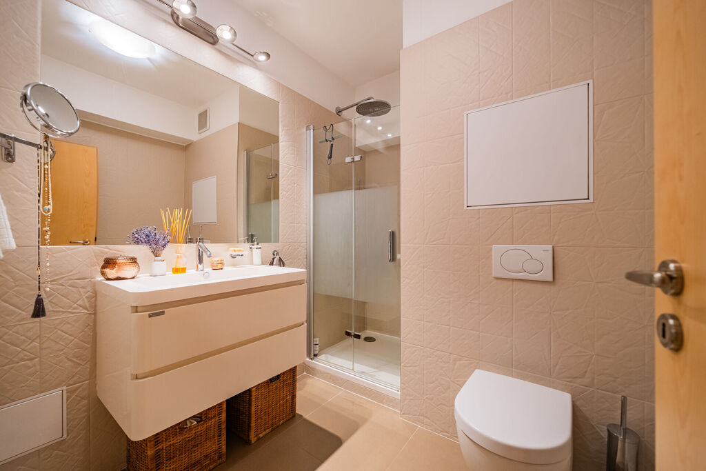 V patře bytu jsou další dva samostatné pokoje s klimatizací a zatemňovacími roletami a překrásným výhledem do zahrady plné zeleně i na Prahu. Koupelna s vanou, připojením na pračku a toaletou. Je zde také hlavní vchod do bytu s chodbou, vestavnou skříní a úložnou komorou. K bytu náleží parkovací stání v garáži a je již zahrnuto v rámci kupní ceny.