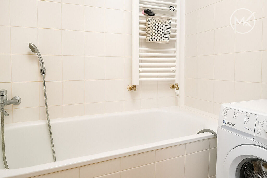 Koupelna s novou vanou, samostatné WC, nová pračka.