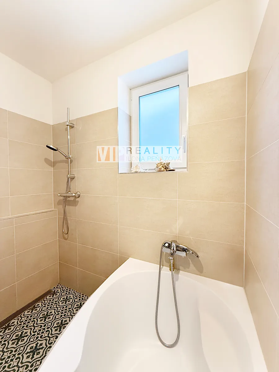 -Koupelna je vybavena vanou i sprchovým koutem, WC je samostatné.