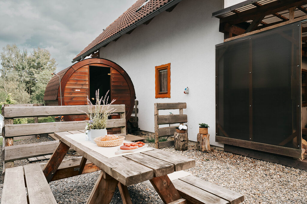 Uzavíratelná terasa + několik venkovních sezení – pozorování lesní zvěře a v neposlední řadě grilování, posezení s knížkou i podzimní hygge.