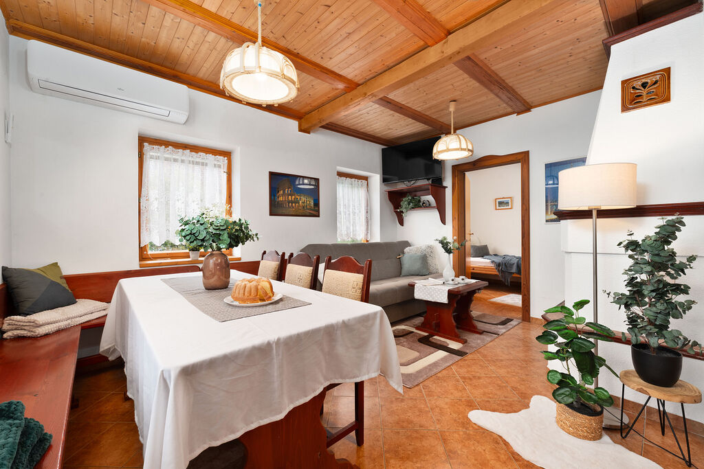 Klimatizace (v létě chladí, v zimě topí) a krb s rozvody tepla do pokojů – celoroční komfort bez kompromisů.