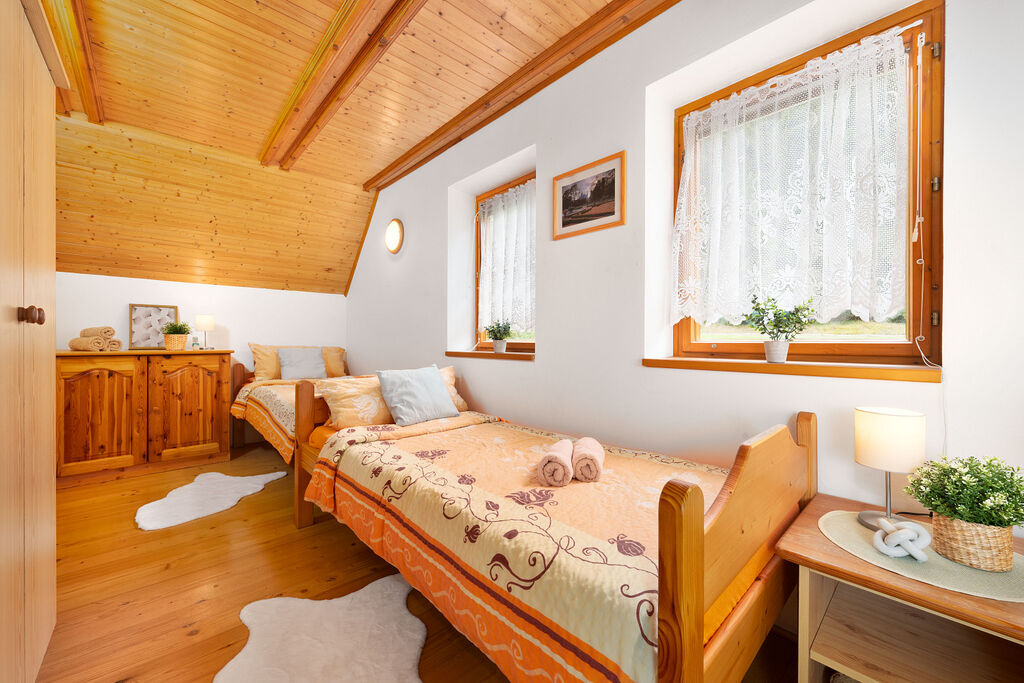 V přízemí dvoulůžkový pokoj + WC. V patře dva pokoje – jeden třílůžkový, druhý čtyřlůžkový – každý s vlastní sprchou a WC. Komfortní uspořádání nejen pro rodinu, ale i pro skupiny hostů.