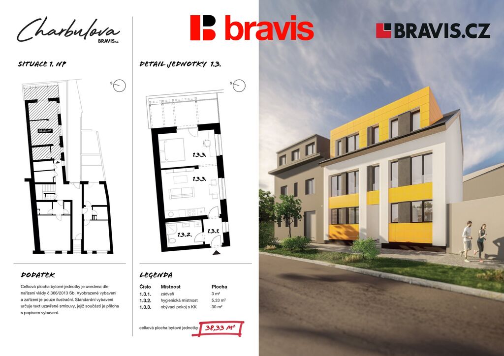 Nabízíme k prodeji bytovou jednotku č.1.3 s dispozicí 1+kk o užitné ploše 38,33m2, která nabízí ideální řešení pro jednotlivce, mladé páry či jako investiční příležitost.