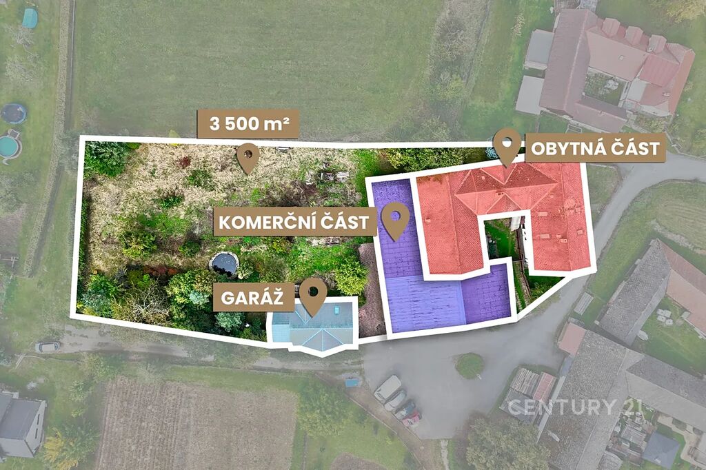 Dům má celkovou zastavěnou plochu 603 m² a nabízí užitnou plochu 460 m². Dalších 160m² nabízí prostor podkroví, který je předělán do obytného stavu. V domě najdeme tři obytné bytové jednotky, které jsou rozložené ve dvou podlažích. Každá bytová jednotka má svůj vlastní vchod. Jejich rozdělení a popis je uveden v 3D půdorysech. V současné chvíli slouží jako ubytování. Nájemce může pokračovat a nebo bude nájemní vztah ukončen před podpisem kupní smlouvy.