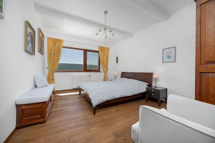 Interiér domu je částečně vybaven a nabízí velkorysé prostory s pěti pokoji, které poskytují komfort pro každého člena rodiny. Dům je postavený ze smíšených materiálů, což přispívá k jeho unikátnímu charakteru. Dispozice: 1.NP-2x zděný sklep, parkování. 2.NP-vstup, prostorný obývací pokoj s vchodem na letní terasu a přední zahradu s výhledem, kde se nachází vířivka, kuchyně, pokoj(pracovna), koupelna s WC, schodiště do patra. 3.NP-prostorná chodba se vstupem na zadní zahradu, 3x ložnice každá s krásným výhledem, koupelna s WC.