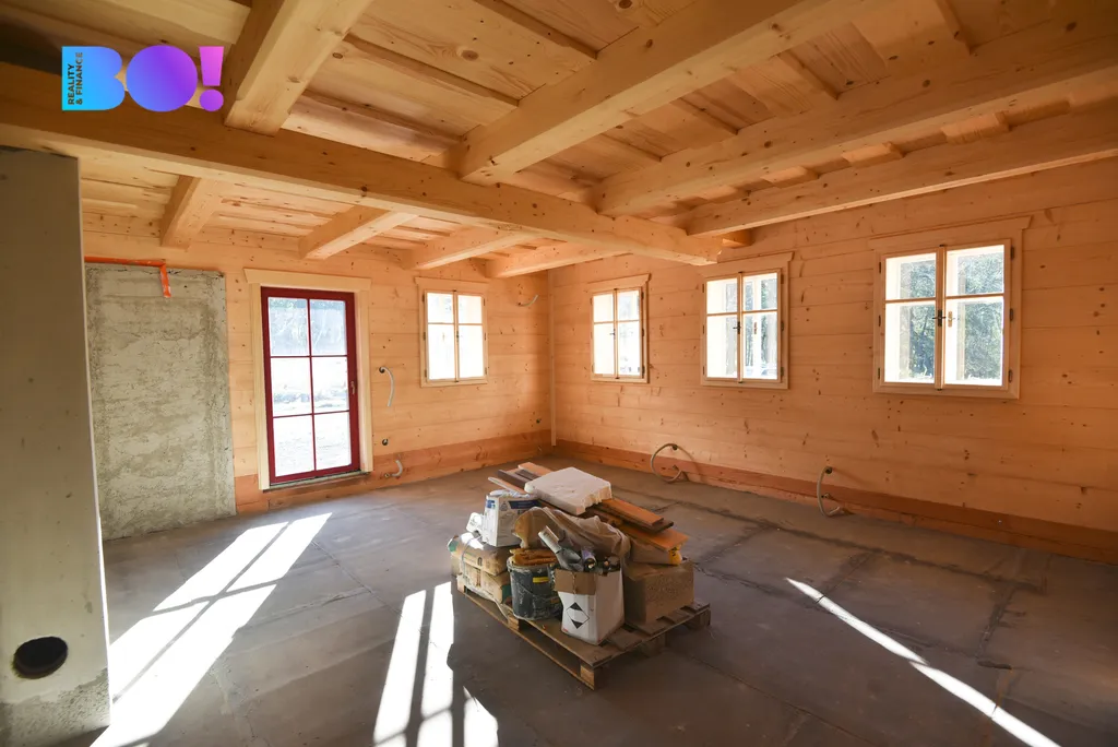 Chalupa je ve fázi hrubé stavby s osazenými kastlovými okny s vakuovanými skly a eurookny ve zděných a neroubených částech chalupy. V případě zájmu zajistíme dokončení stavby dle Vašeho požadavku.