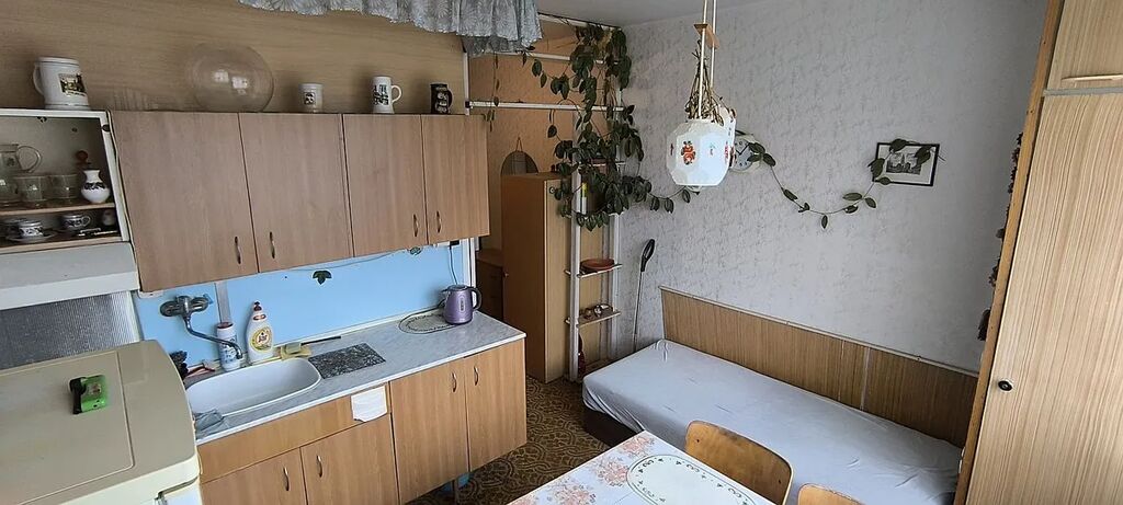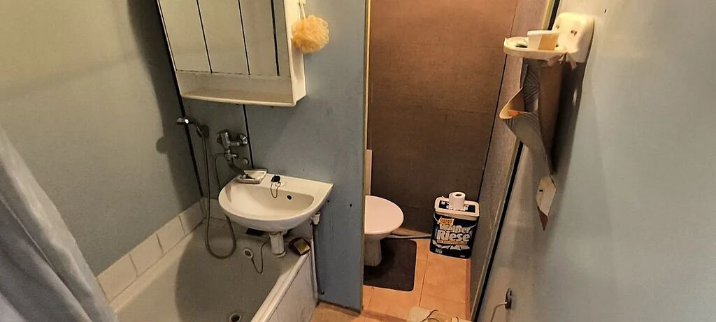 Předsíň, koupelna s vanou a WC, kuchyň, prostorný obývací pokoj s balkonem.