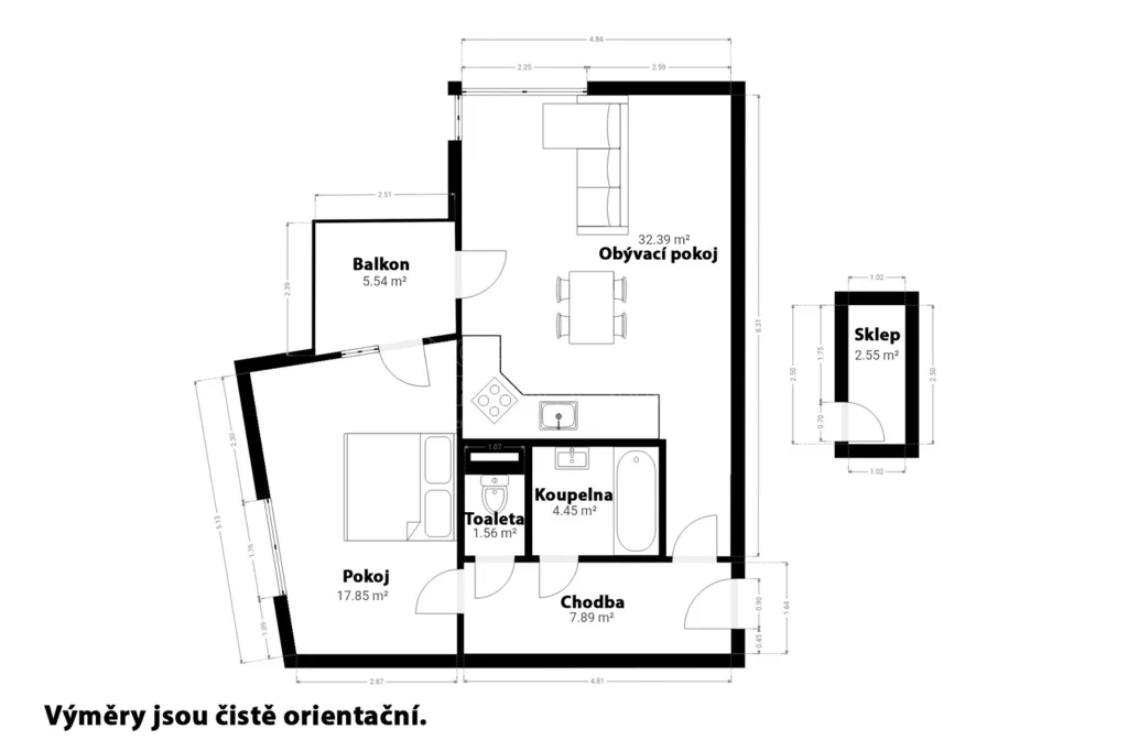 Vybavení zahrnuje moderní kuchyňský kout s obývacím pokojem a vstupem na balkon, oddělenou ložnici se vstupem na balkon a samostatné WC a koupelnu.