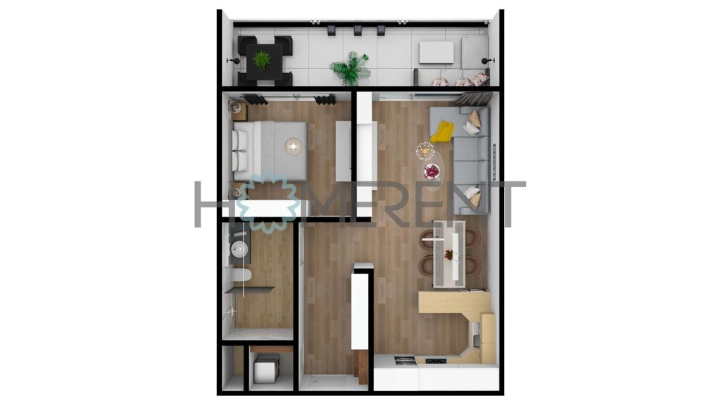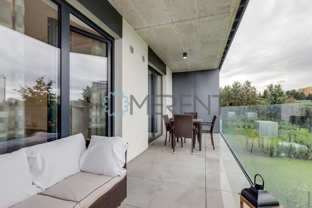 Dominantou bytu je velká lodžie přístupná z obou místností, ideální pro ranní kávu nebo večerní relax.