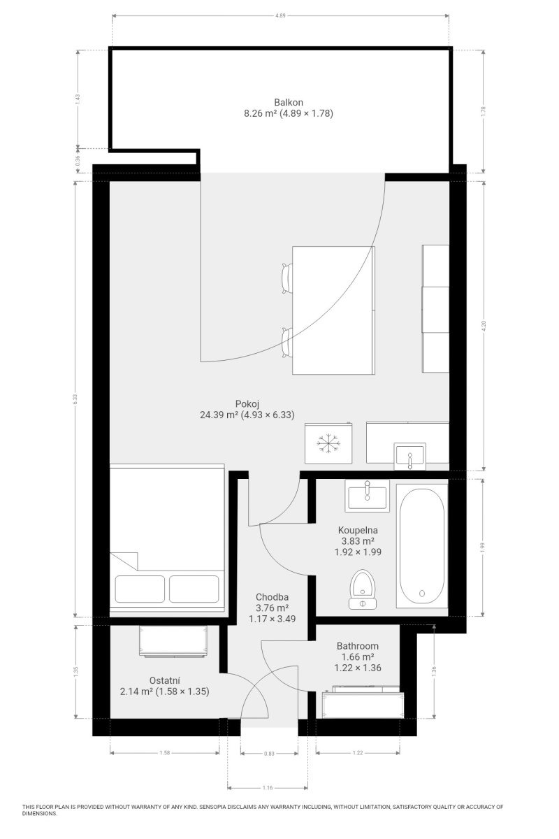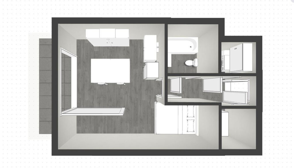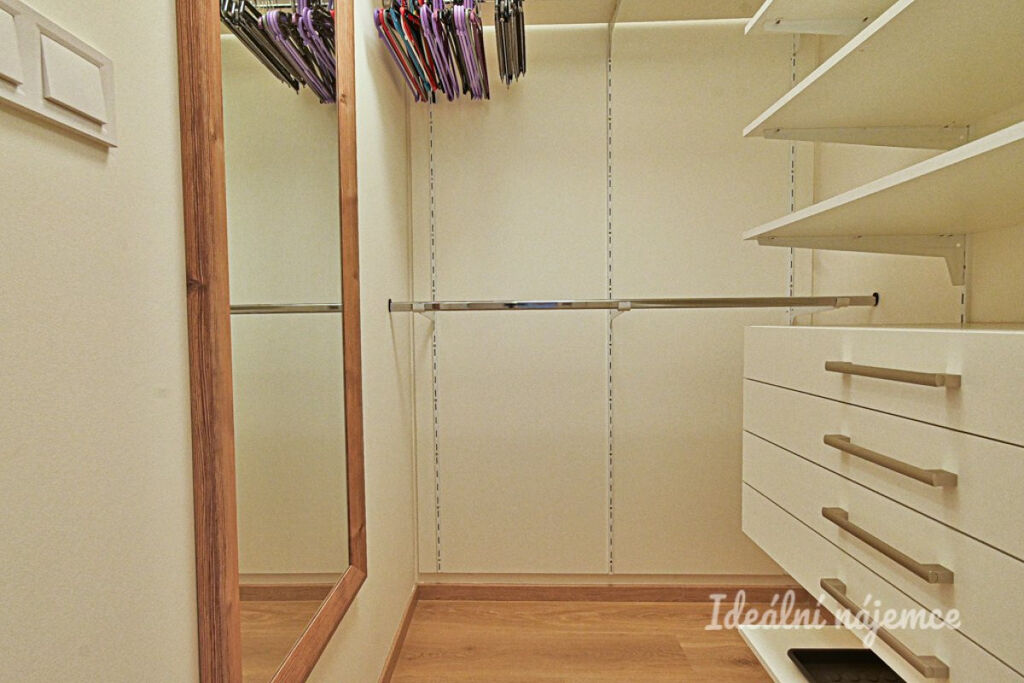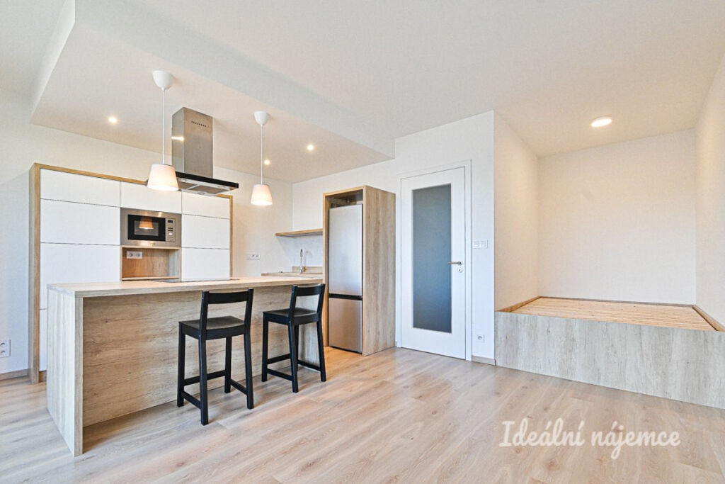Dispozice bytu nabízí praktické rozčlenění prostoru. Kuchyňská linka s ostrůvkem a barovým sezením je vybavena kvalitními spotřebiči – lednicí, varnou deskou, troubou, digestoří, mikrovlnnou troubou a myčkou. V hlavní místnosti je dostatek prostoru pro oddělení obývací a spací části. Součástí bytu je také samostatná šatna a technická místnost s pračkou.