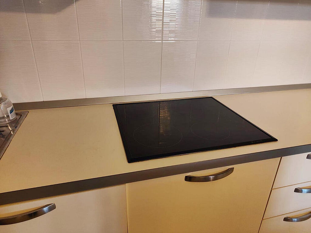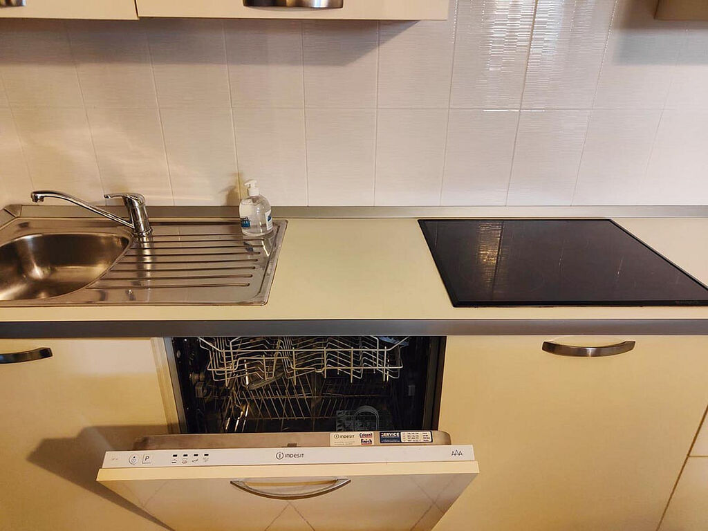 Moderní kuchyň s indukční varnou deskou, myčkou nádobí, troubou a lednicí.