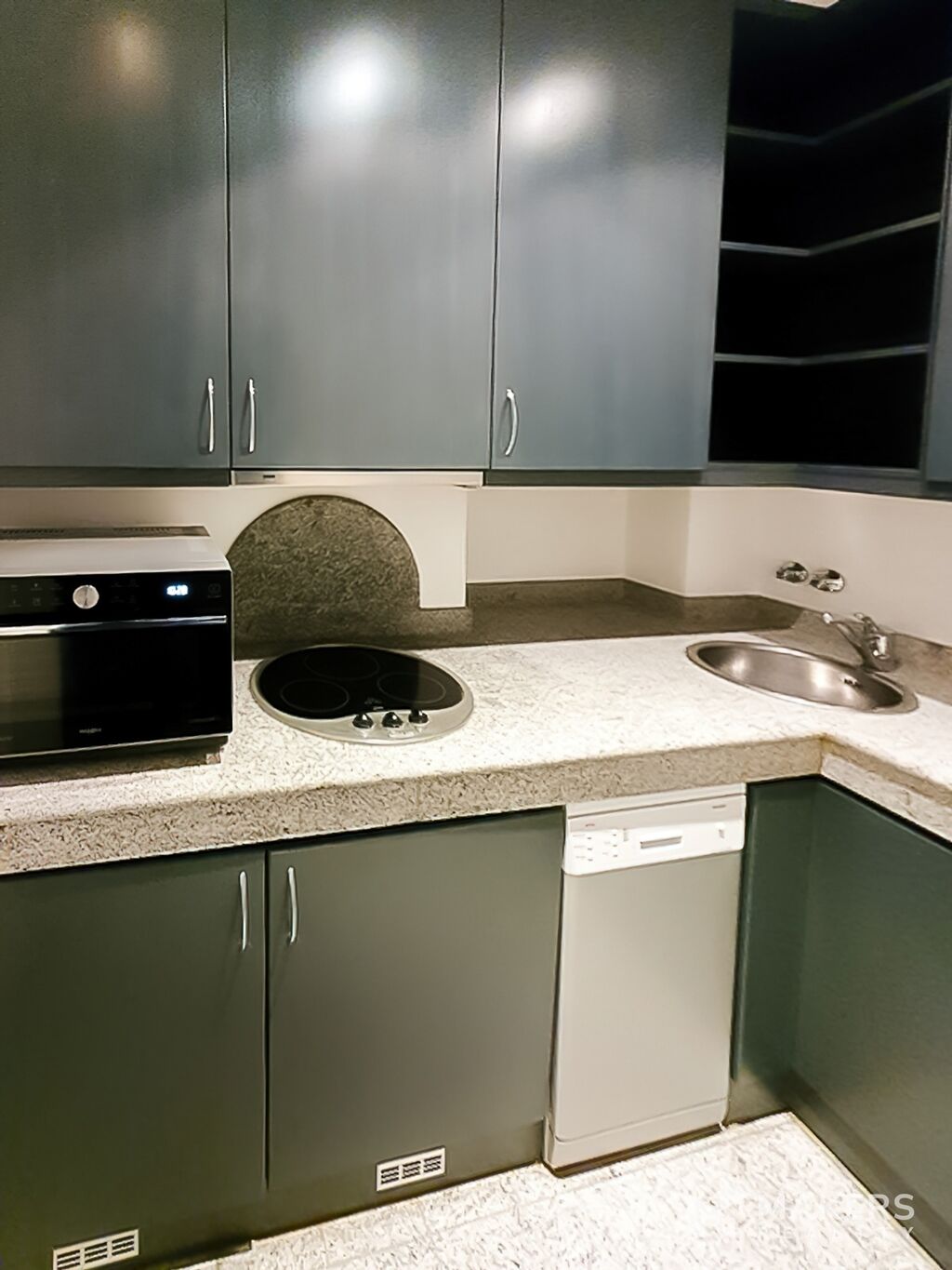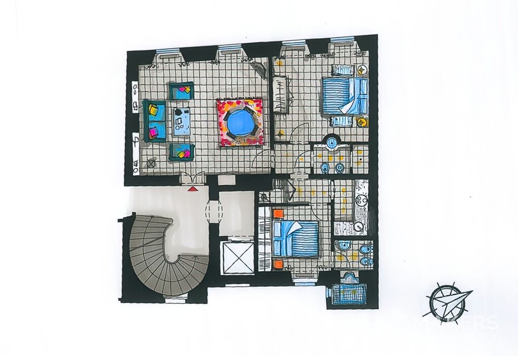 Interiér tvoří prostorný obývací pokoj s jídelní částí, dekorativním krbem a původním ručně malovaným dřevěným stropem. Kuchyň je samostatná a kompletně vybavená spotřebiči. K dispozici jsou dvě neprůchozí ložnice a dvě koupelny – jedna s vanou, druhá se sprchovým koutem. Součástí bytu je také technická místnost s pračkou a sušičkou. Vkusně zvolený nábytek podtrhuje historický charakter prostoru a nabízí komfortní bydlení.