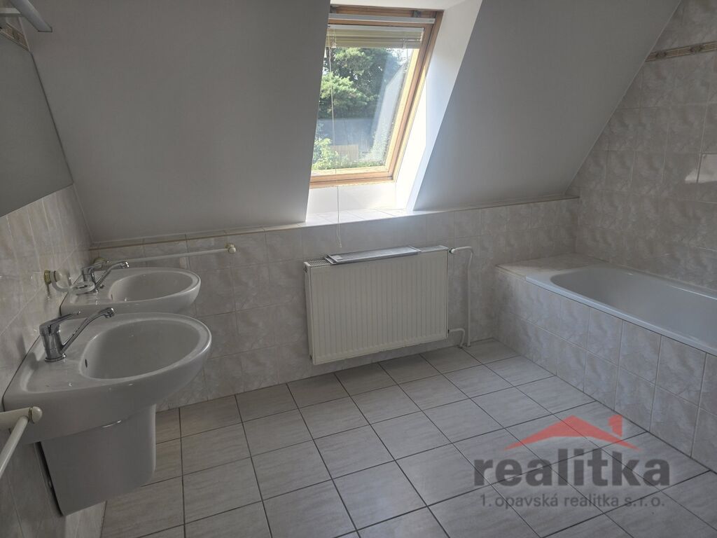 Nabízíme pronájem velkého bytu 3+kk, 120 m2 v rodinném domě v atraktivní lokalitě Opavy na Slovenské ulici. Byt se nachází v 1. patře. Přízemí domu obývá majitelka. 1. patro je k pronájmu. Obývací pokoj je propojený s jídelnou a kuchyní se spoustou úložného prostoru, další 2 pokoje jsou zvlášť. Nad schodištěm je ještě otevřený prostor.. V koupelně je vana a 2 umyvadla. WC s umyvadlem je zvlášť. Nájem je stanoven na 16.000,-Kč, topení, voda a elektřina dle počtu osob paušálně cca 5.000,-Kč. Kauce po domluvě, provize RK 16.000,-Kč. Volné ihned.
