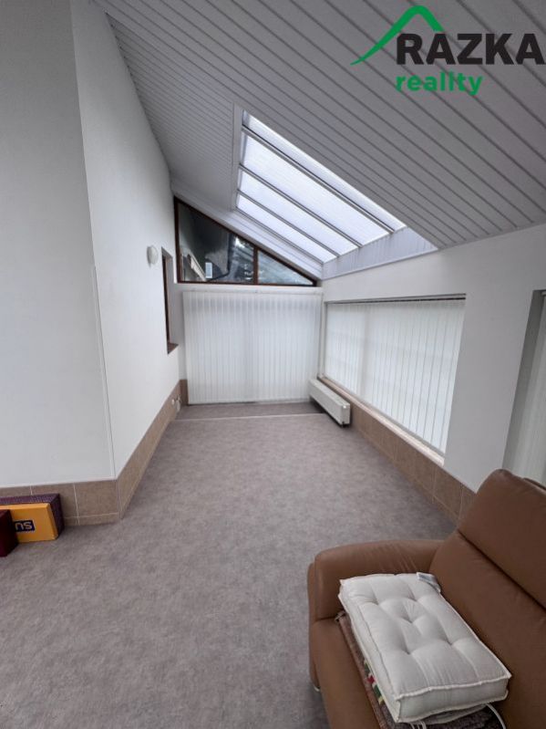 Přízemí prostorný obývací pokoj se vstupem na terasu, kuchyň se spíží, ložnice s vlastní koupelnou, samostatné WC a přístavba s rohovým vnitřním bazénem a druhou terasou.