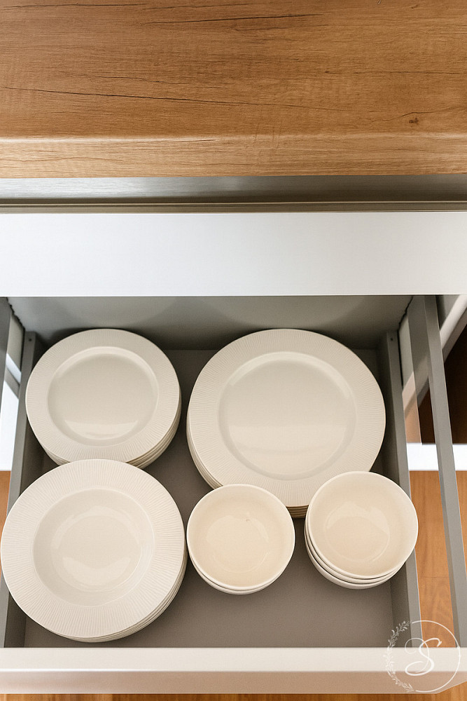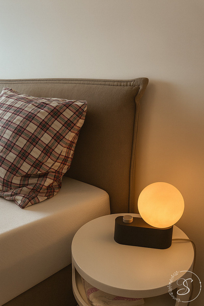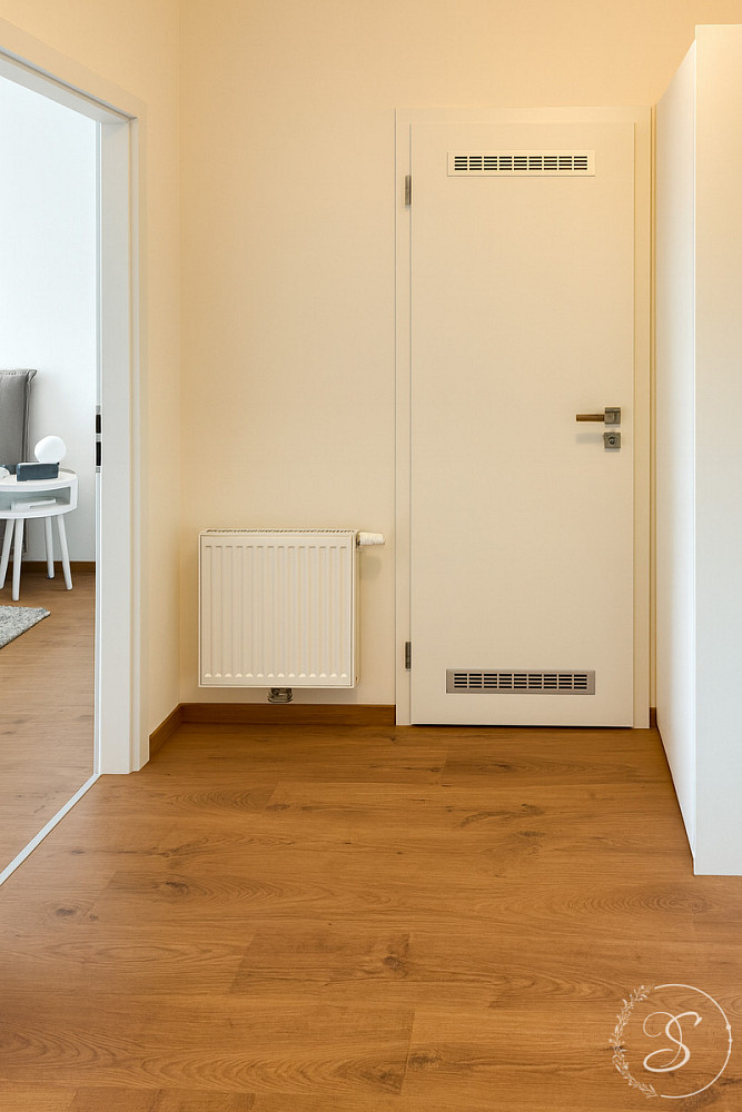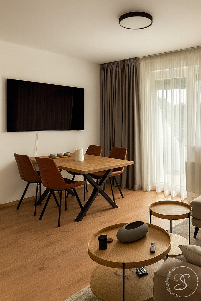 Interiér bytu byl navržen s důrazem na kvalitu, komfort a nadčasový design. Prostorný obývací pokoj s luxusní kuchyňskou linkou je vybaven špičkovými spotřebiči (lednice, trouba, varná deska, kávovar, konvice, kompletní sada nádobí). Dále se zde nachází útulná ložnice s šatnou, elegantní koupelna se sprchovou vanou, toaletou, pračkou a sušičkou, vstupní chodba a technická místnost. Byt působí vzdušně a svěže díky velkoformátovým oknům, elektrickým venkovním žaluziím a designovým zatemňovacím závěsům.