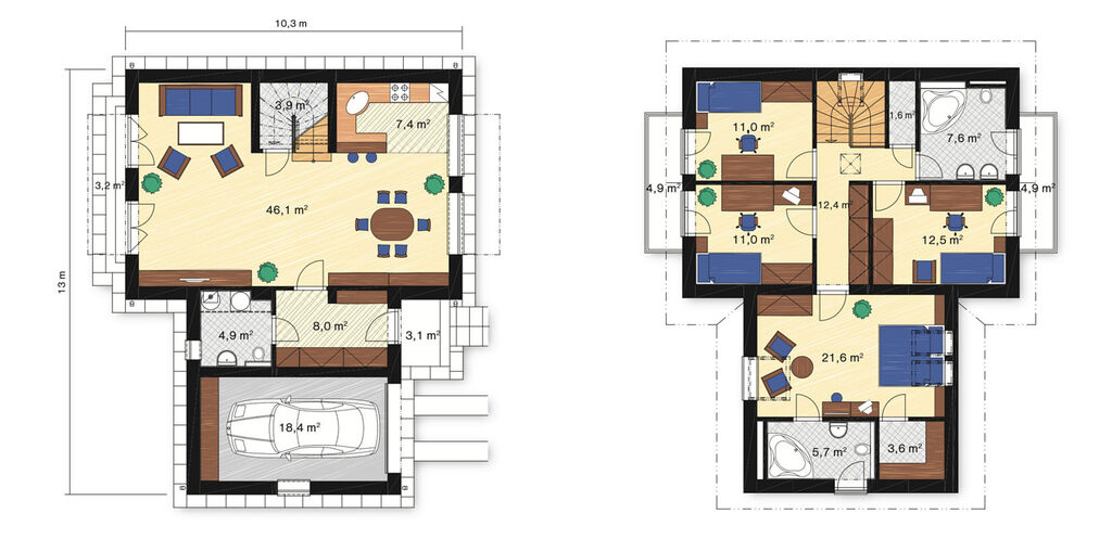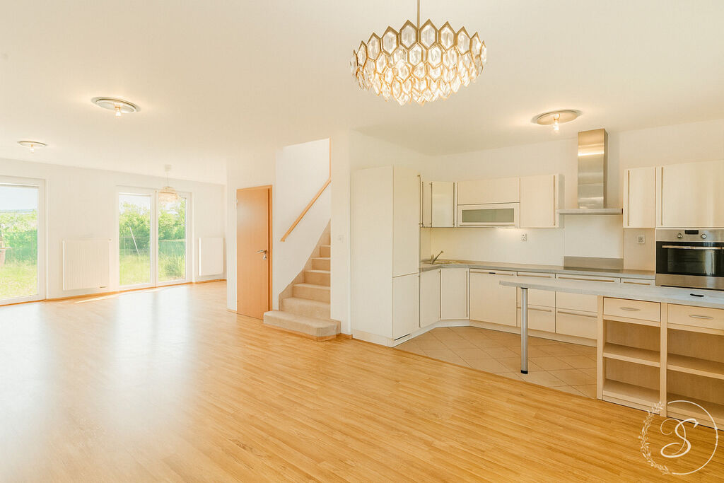 Na obývací prostor navazuje moderní, plně vybavená kuchyň s ostrůvkem a vestavěnými spotřebiči (lednice, myčka, pečicí a mikrovlnná trouba, digestoř), která splní očekávání i náročnějších kuchařů. V přízemí se dále nachází praktická spíž, koupelna se sprchovým koutem a toaletou a vstup do garáže.
