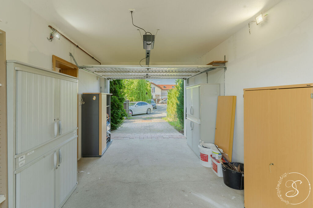 Garážová vrata značky Hörmann s automatickým pohonem ProMatic umožňují pohodlný vjezd; garáž má průchozí vstup přímo na zahradu. Elektrická posuvná brána a oplocení zajišťují soukromí a bezpečí, dům je navíc vybaven bezpečnostním systémem s alarmem. Vytápění zajišťuje plynový kotel, v obývacím pokoji je možnost přitápět krbem. Okna jsou vybavena předokenními roletami, které pomáhají regulovat teplotu a zvyšují komfort i soukromí.