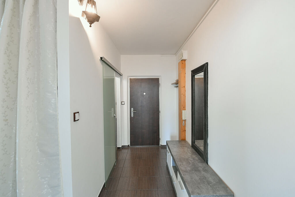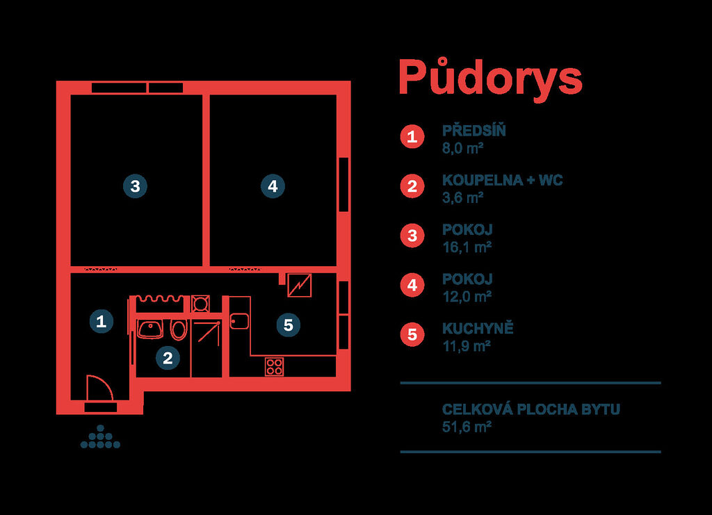 Byt se nachází v 6. nadzemním podlaží (5. patro) revitalizovaného panelového domu s dvěma výtahy a nabízí celkovou podlahovou plochu 51,6 m². Dispozičně je velmi prakticky řešen – oba pokoje jsou neprůchozí, což zajišťuje dostatek soukromí pro všechny obyvatele. Byt prošel v nedávné době renovací – má zděné bytové jádro, plastová okna, novější podlahové krytiny, upravenou koupelnu i vcelku novou kuchyň, a působí tak velmi příjemným dojmem.