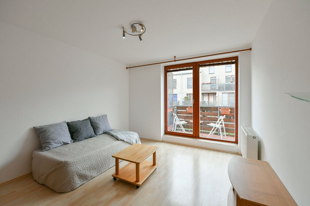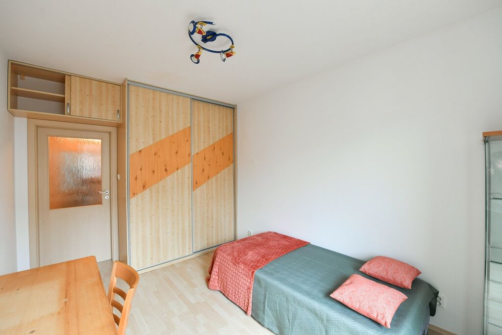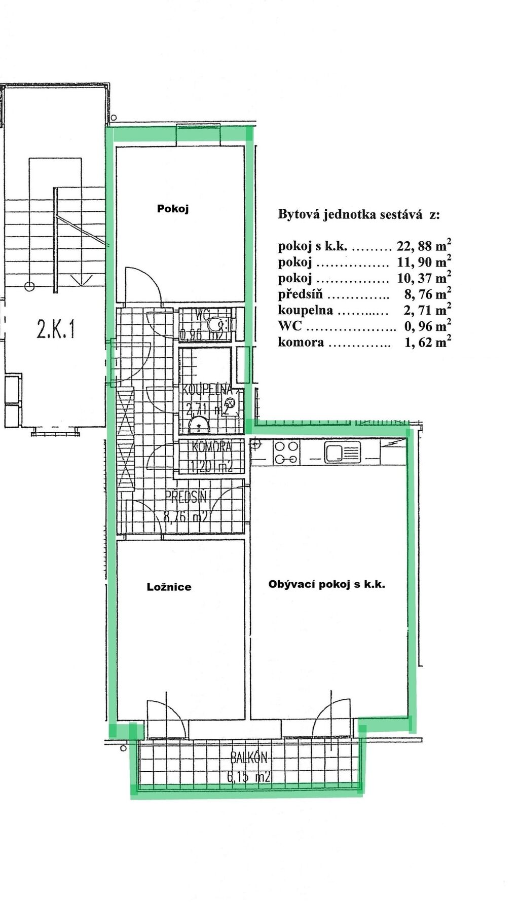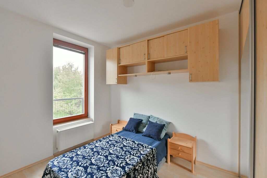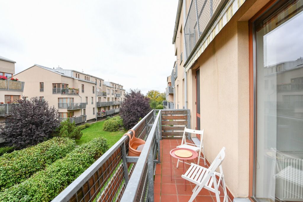 Byt je klidný, světlý a vhodný pro rodinu nebo páry. Skládá se z obývacího pokoje propojeného s kuchyní (22,88 m2), dvou ložnic (11,90 m2 a 10,37 m2) s praktickými vestavěnými skříněmi, koupelny (2,71 m2) se sprchovým koutem, samostatného WC, předsíně (8,76 m2), komory (1,62 m2) a velkého balkonu (6,15 m2). Na ten je vstup z obývacího pokoje i z jedné z ložnic a má hezký výhled do upraveného vnitrobloku, kde je možnost posezení na lavičkách a je ideálním místem na hraní pro malé děti. K bytu náleží i venkovní parkovací stání.