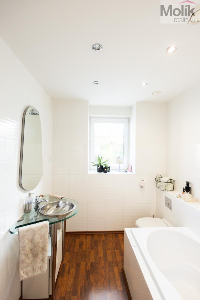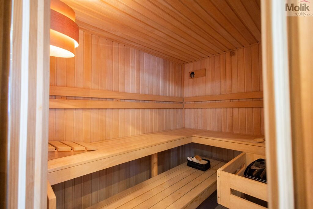 Nabízí tři samostatné pokoje, kuchyň, koupelnu s vanou a vířivkou, saunu a velkou technickou místnost, ve které je pračka, sušička, žehlící prkno i věšák na prádlo. Celý byt působí velmi útulně, je světlý, moderní a prakticky řešený.