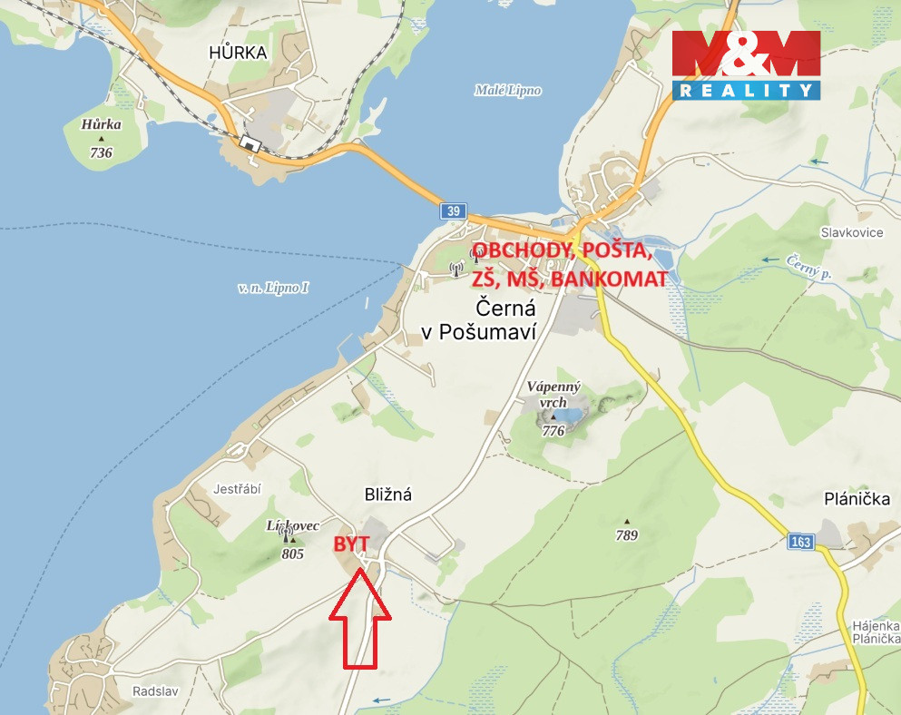 Před domem je parkoviště. Veškerá občanská vybavenost je dostupná ve 2 km vzdálené Černé v Pošumaví a k lipenské pláži je to pouhý 1 km.