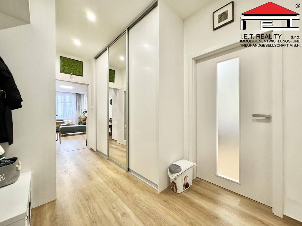 Byt prošel v roce 2021 citlivou kompletní rekonstrukcí s důrazem na maximální komfort a praktičnost. Je zařízen kvalitním interiérem na míru, který z většiny zůstává součástí prodeje. Disponuje podlahovou plochou 87 m² (užitná plocha činí 81 m²) a náleží k němu balkón (cca 1 m²) a zděná sklepní kóje (cca 4 m²) s výlučným užíváním pouze pro tuto bytovou jednotku.