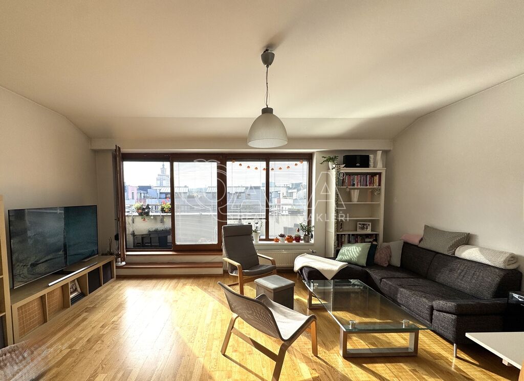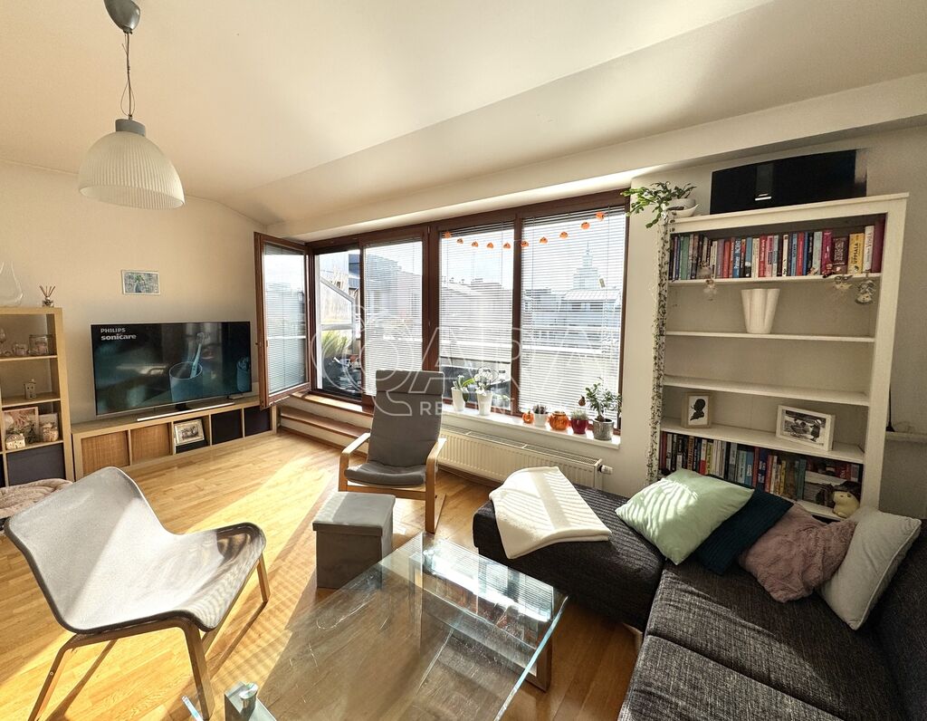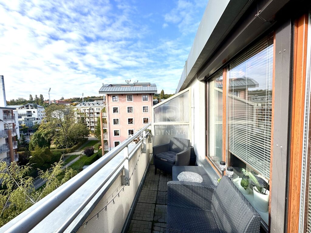 Jednotka se nachází v 6. NP a na patře jsou pouze jedni sousedé. Vstupní chodba s úložnými prostory v podobě posuvné skříně. Obývací pokoj s plně vybaveným kuchyňským koutem a vstupem na terasu. Sedačka, venkovní posezení, jídelní stůl se židlemi součástí vybavení.