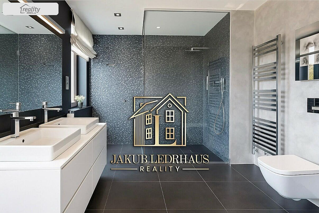 Hlavní ložnice disponuje šatnou a koupelnou se sprchovým koutem, dvěma umyvadly a toaletou.